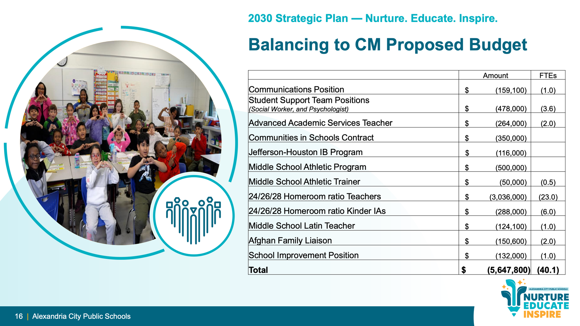 If Council does not provide the additional $5.6 million, ACPS presented a detailed accounting of what would have to be eliminated: 23 homeroom teachers, social workers and psychologists, the middle school athletic program, Communities in Schools wraparound services, the Jefferson-Houston IB program, an Afghan family liaison, and other positions — totaling 40.1 FTEs and $5.6 million.
