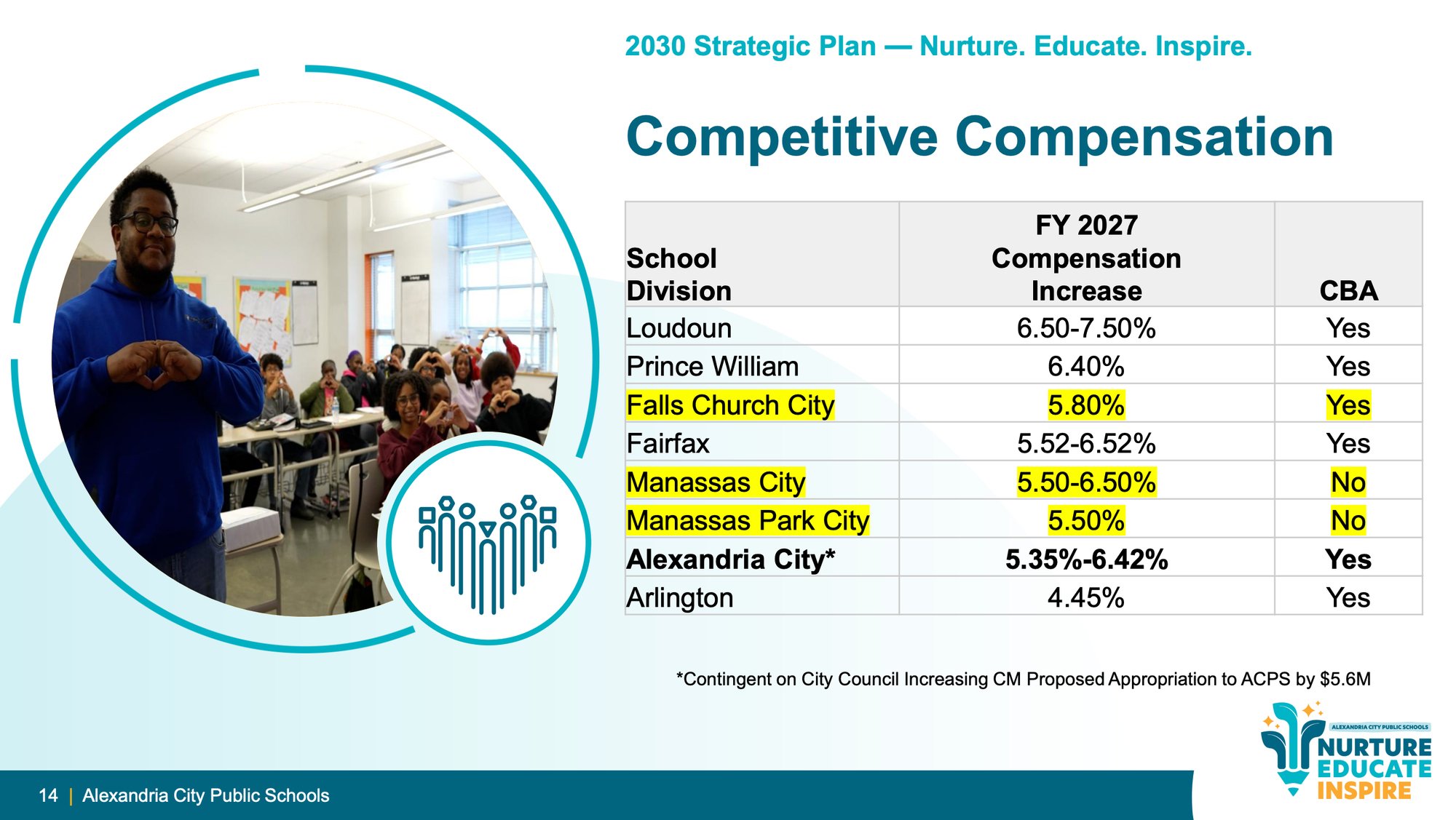 School Board member Tim Beatty put it plainly: even without a collective bargaining agreement, ACPS was likely going to have to approach these compensation numbers to remain competitive. "If we weren't in the 5% range that we're talking about here, we would fall further behind," he said. "We're already seventh out of eight in the region."