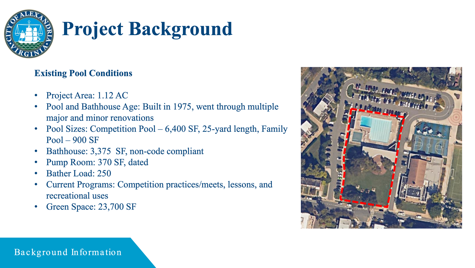 The project calls for a complete replacement of the existing pool and bathhouse at 1609 Cameron St., which was built in 1975. The current bathhouse has been found to be out of code compliance, and the pump room is described as dated. The existing facility has a bather load of 250 and includes a 6,400-square-foot competition pool and a 900-square-foot family pool, according to a presentation delivered at a September community meeting.
