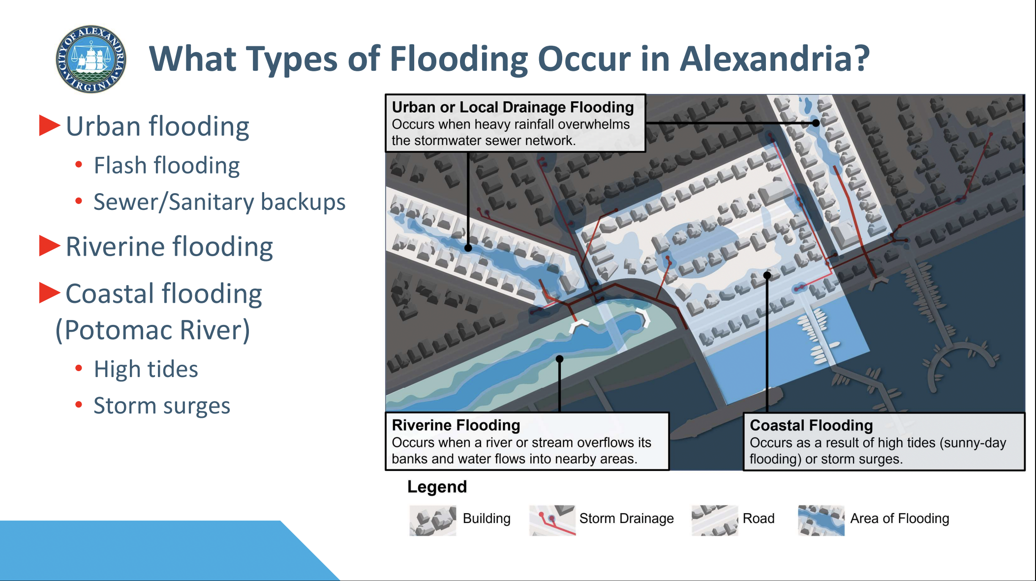 City flood modeling identifies urban flooding, including flash floods and sewer backups, riverine flooding from streams and rivers, and coastal flooding from the Potomac River caused by high tides and storm surges.