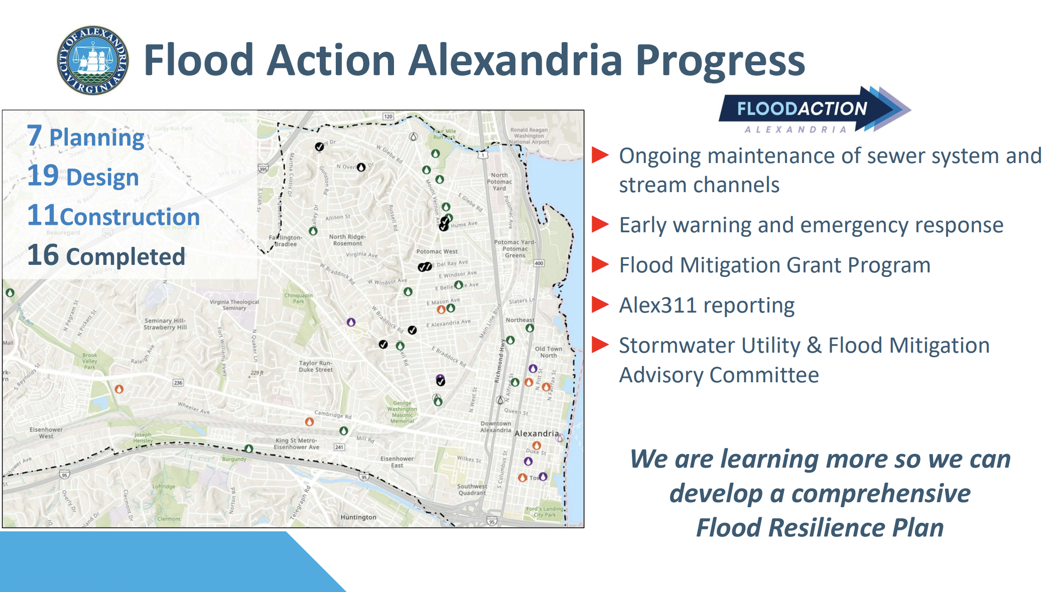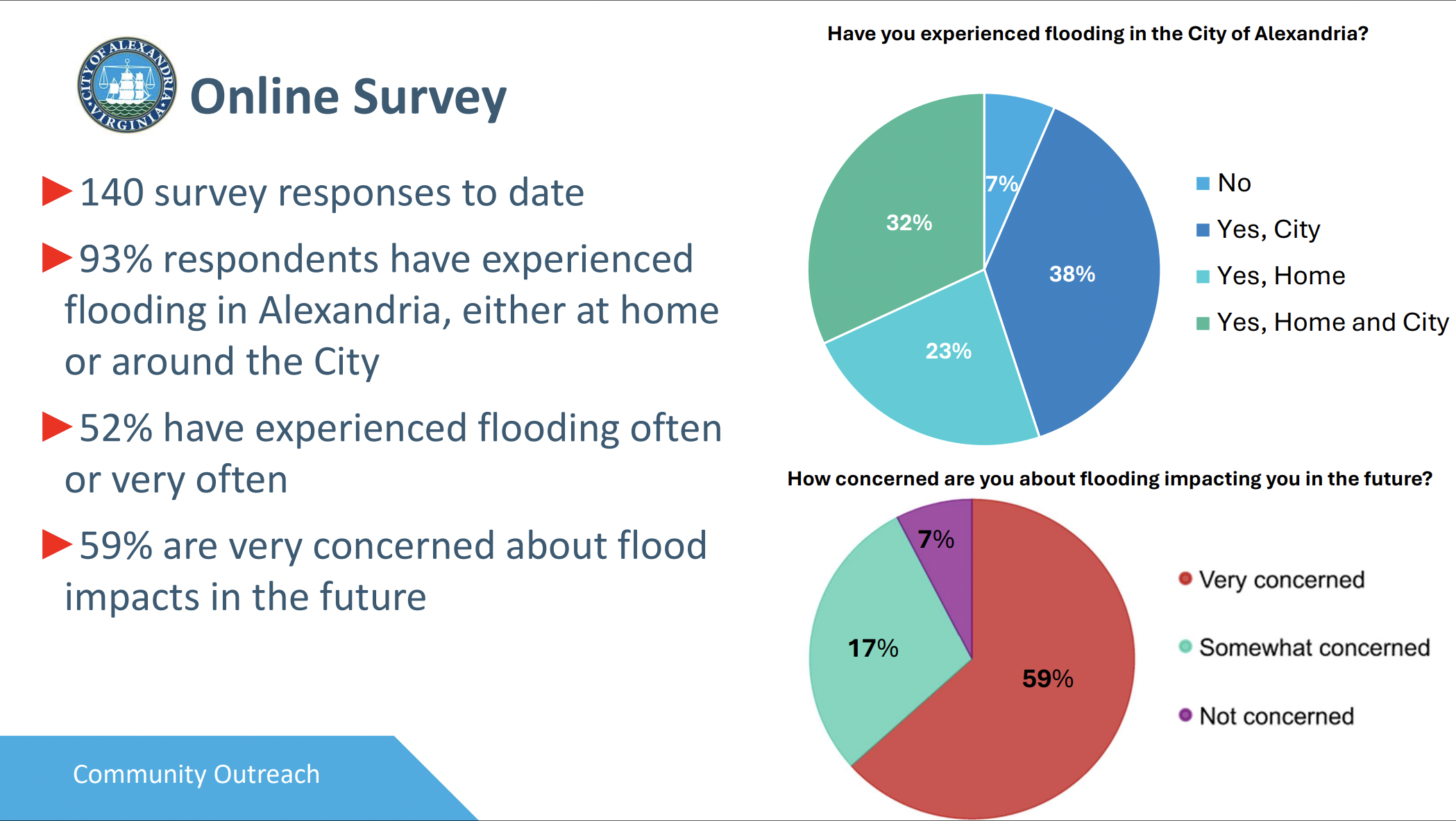An online community survey has collected 140 responses, with 93% of respondents reporting flooding experiences in Alexandria. Fifty-two percent reported experiencing flooding often or very often. The survey has mapped 128 flood locations citywide and remains open through Nov. 30 at bit.ly/AlexCommunitySurvey.