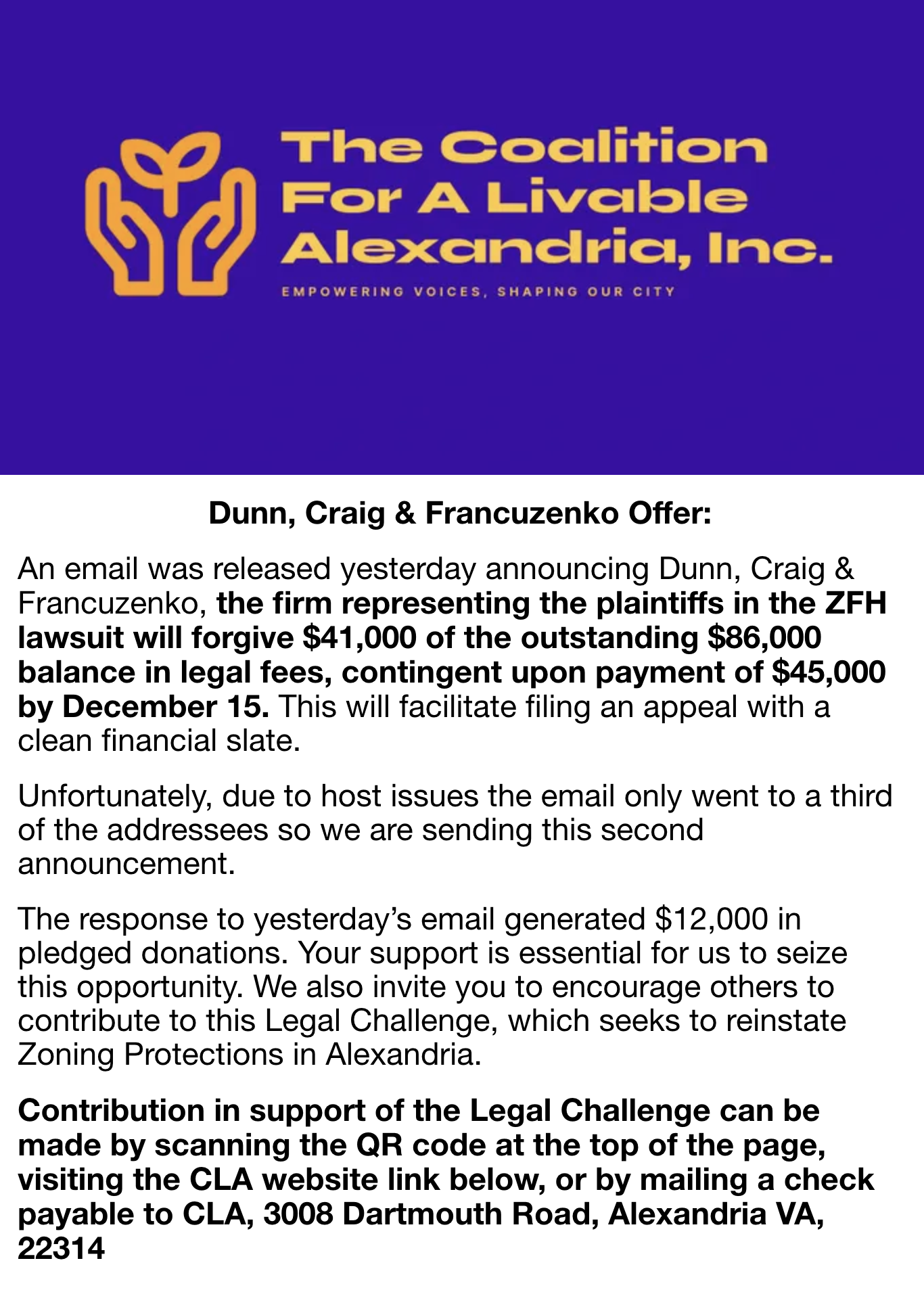 The law firm representing plaintiffs in a lawsuit challenging Alexandria’s elimination of single-family zoning has offered to forgive nearly half of its outstanding fees if the remaining balance is paid by mid-December, according to the Coalition for a Livable Alexandria.