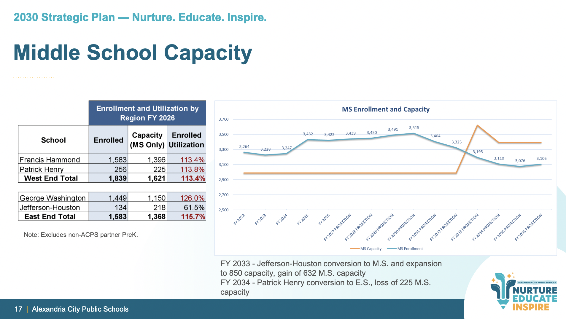 The debate comes as both middle schools operate significantly above capacity, with Francis C. Hammond at 113% utilization and George Washington at 126% utilization, well above the district’s target range of 90-110%. District projections show middle school enrollment peaking at 3,515 students in fiscal 2031 before declining to 3,105 by fiscal 2036.