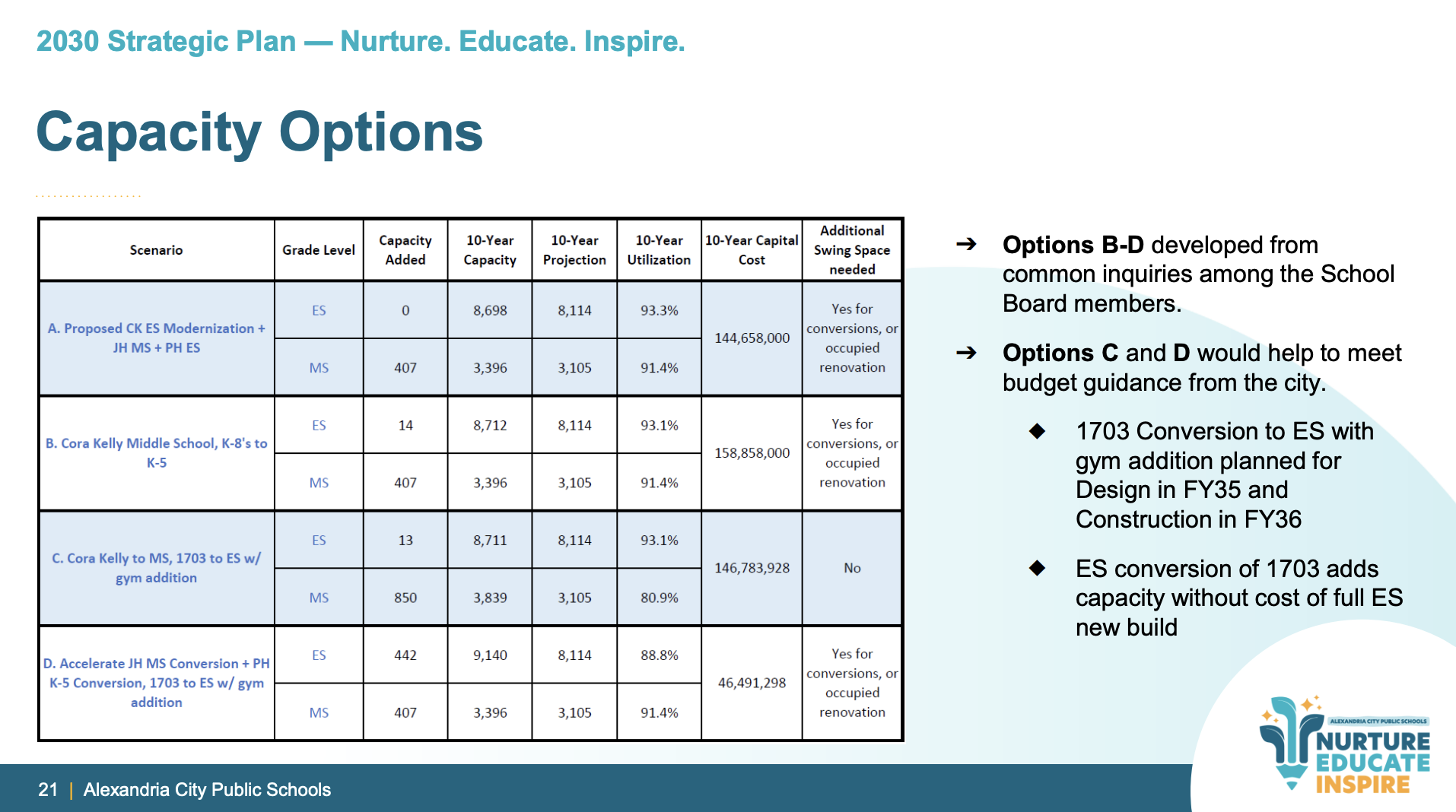 During Tuesday’s work session, Scioscia proposed an alternative that would accelerate the timeline for the Jefferson-Houston and Patrick Henry conversions while postponing the $105 million Cora Kelly Elementary modernization. That alternative scenario would cost $46.9 million and stay within city budget guidance, freeing approximately $98 million for other needs including the transportation facility.