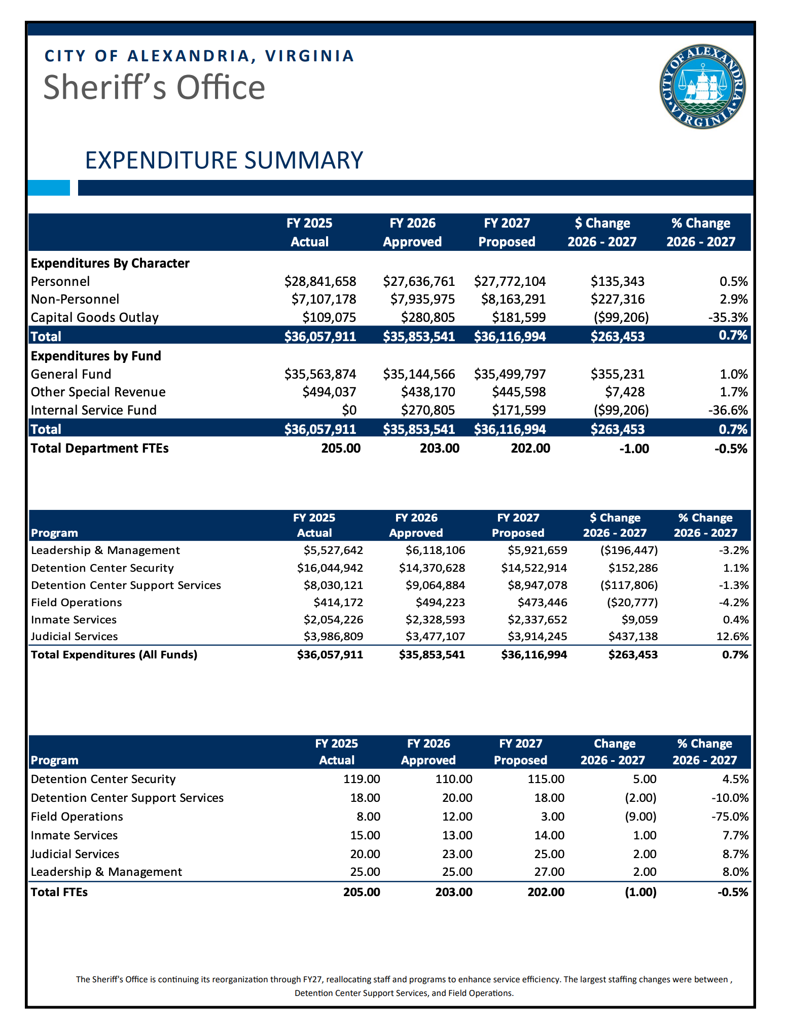 City Manager James Parajon has proposed a FY 2027 sheriff's budget of $36,116,994 — an increase of $263,453, or 0.7%, over the current approved budget. The single proposed cut: eliminating one vacant deputy sheriff position in Judicial Services, saving $93,523.
