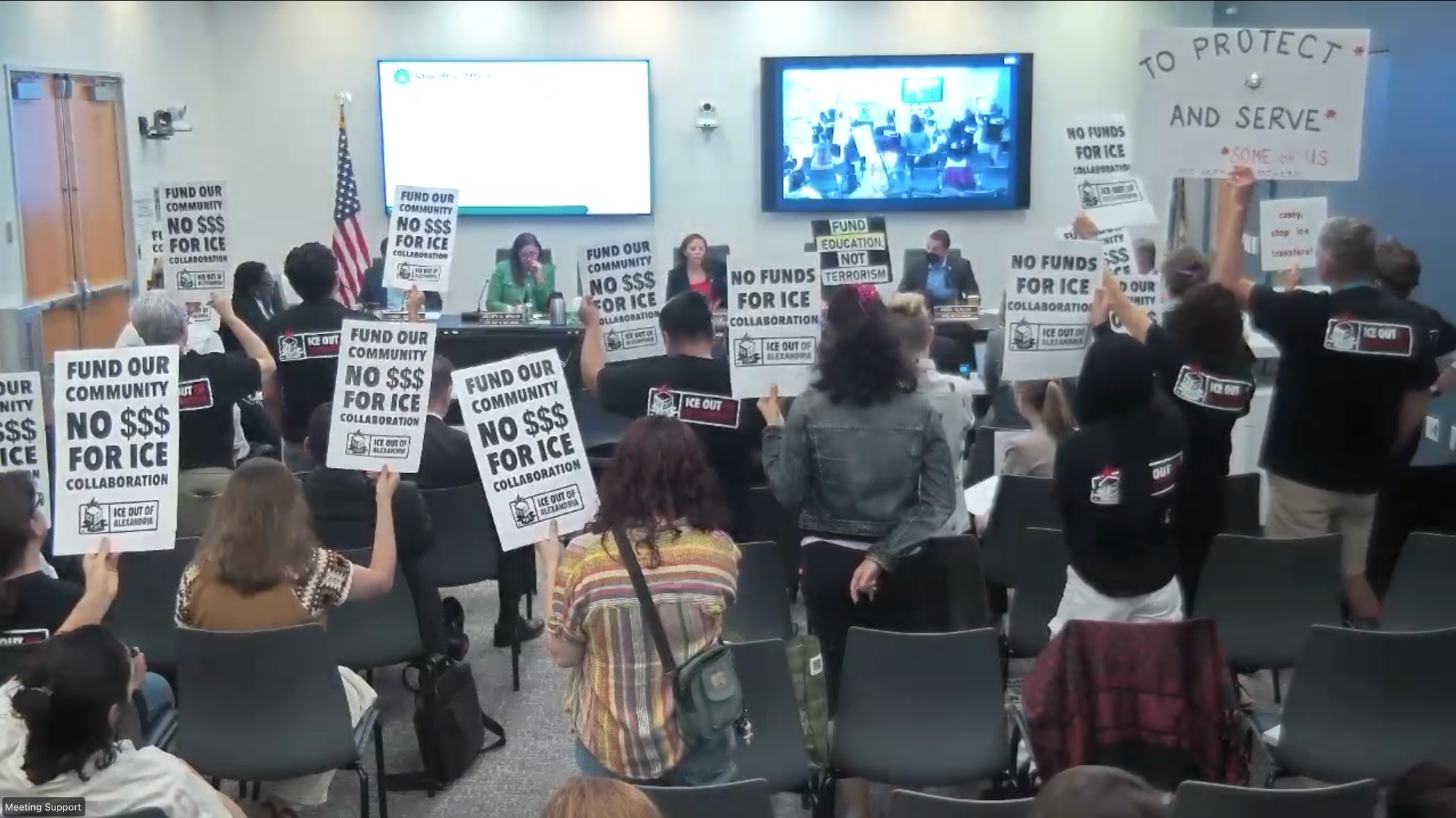 Sheriff Sean Casey spent 36 minutes before five members of City Council on Wednesday night answering detailed questions about the cost of running the jail, the status of an unfinished agreement with the city, and why his office has no performance indicators in the proposed budget — while dozens of ICE Out of Alexandria protesters filled the chambers holding signs calling for an end to ICE transfers.