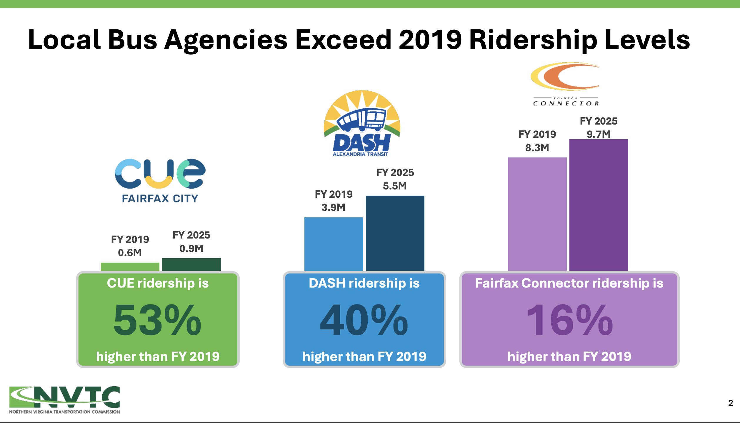 The trend extends across Northern Virginia. Metro has sustained over 50 consecutive months of ridership growth, while bus services regionwide show similar increases.