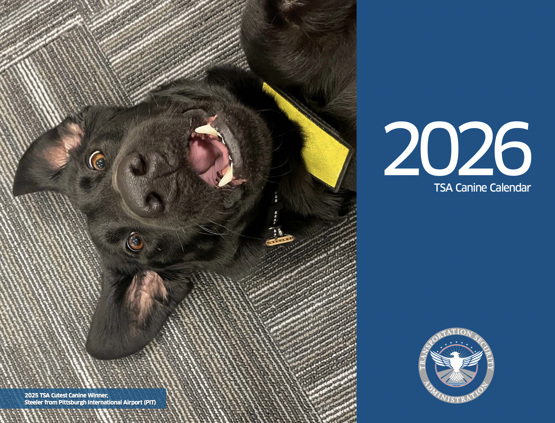 The 2026 calendar cover features Steeler, a nearly 3-year-old black Labrador retriever from Pittsburgh International Airport who won TSA’s 2025 cutest canine contest. Steeler and his littermates were born on Super Bowl Sunday 2023 and all named after NFL teams.