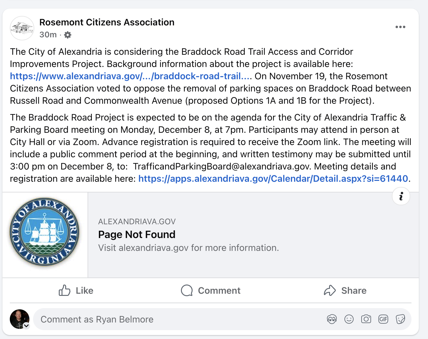 The RCA’s Facebook announcement directed residents to the Traffic and Parking Board meeting on Monday, December 8, at 7 p.m., where the Braddock Road project is expected to be discussed.