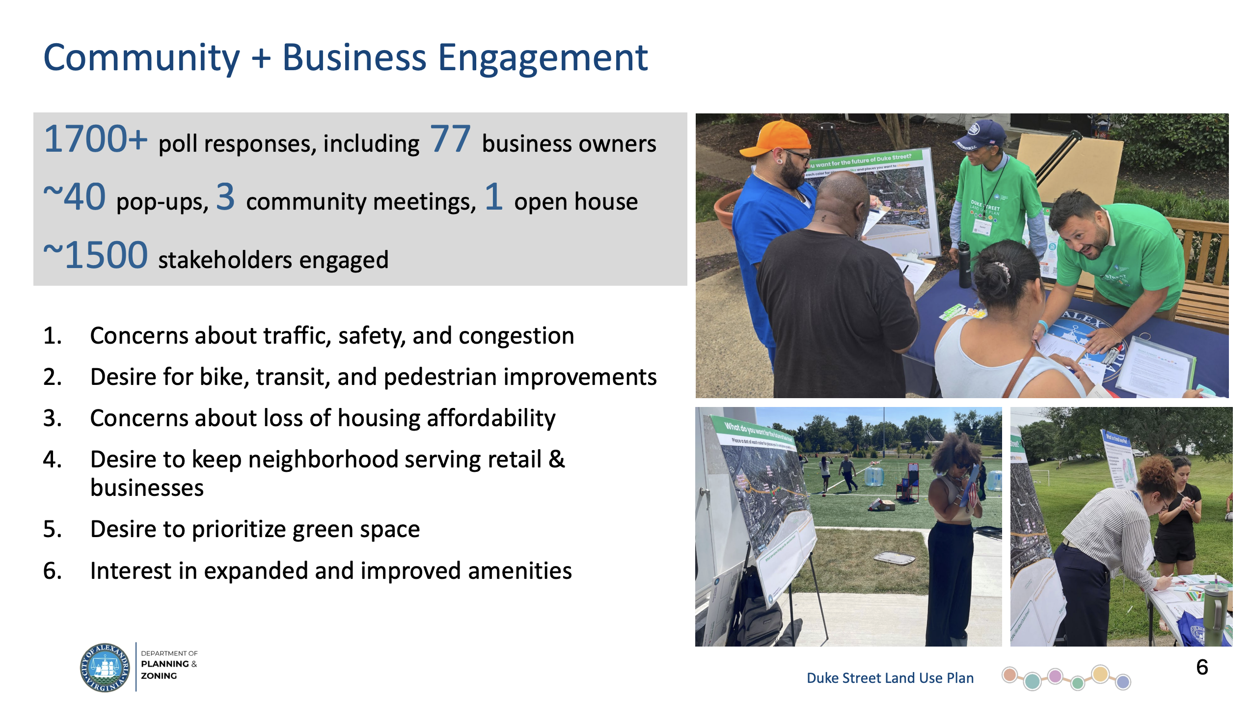 Staff have engaged roughly 1,500 stakeholders through more than 40 pop-up events, three community meetings, and an open house since the process launched in June 2025. More than 1,700 poll responses have been collected, including from 77 business owners.