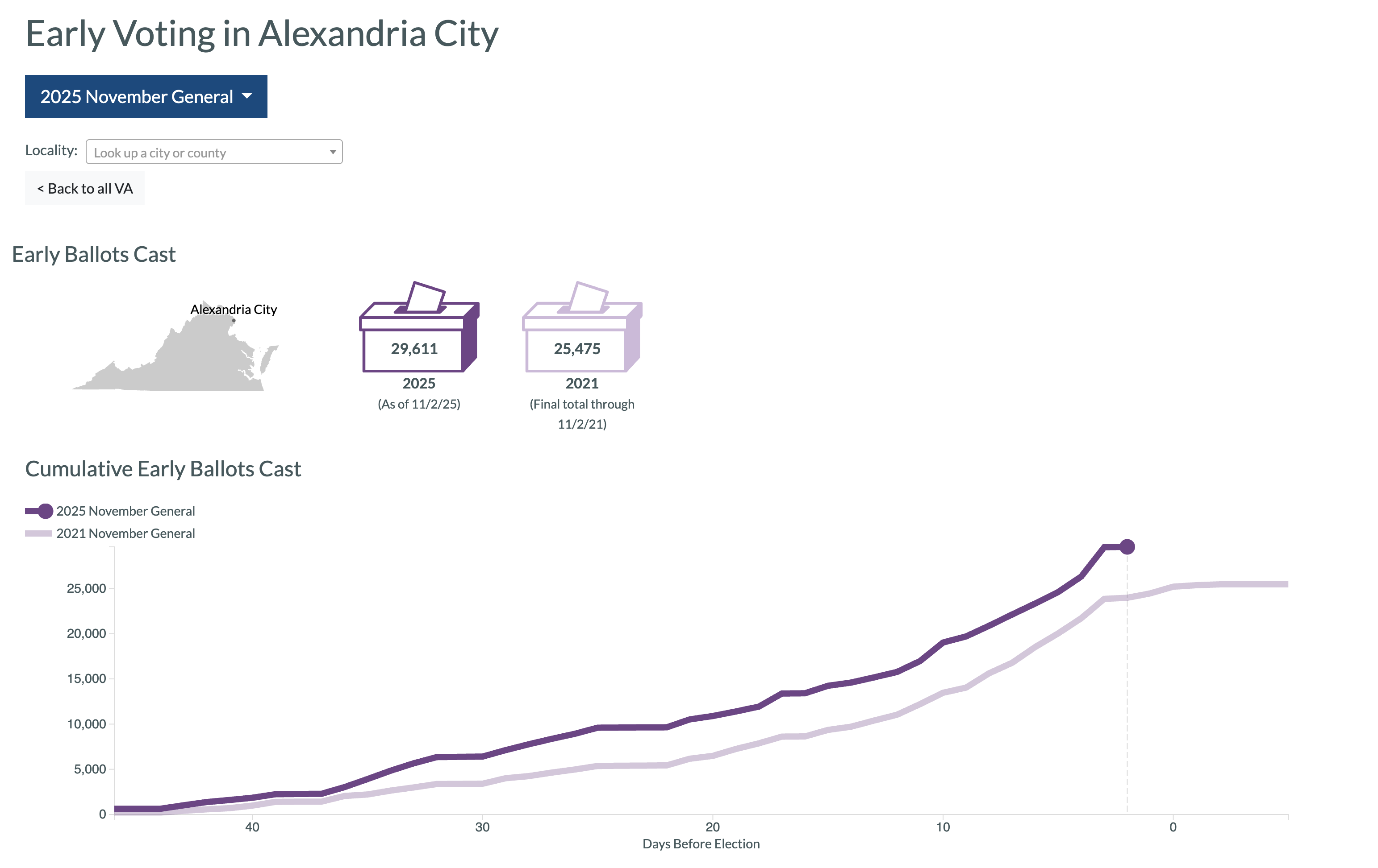 Alexandria recorded 29,611 early votes as of Nov. 2 — 23.5% more than the 23,976 ballots cast at the same point in 2021, two days before that election, according to data from the Virginia Public Access Project. Of those ballots, 22,051 were cast in person and 7,560 by mail.