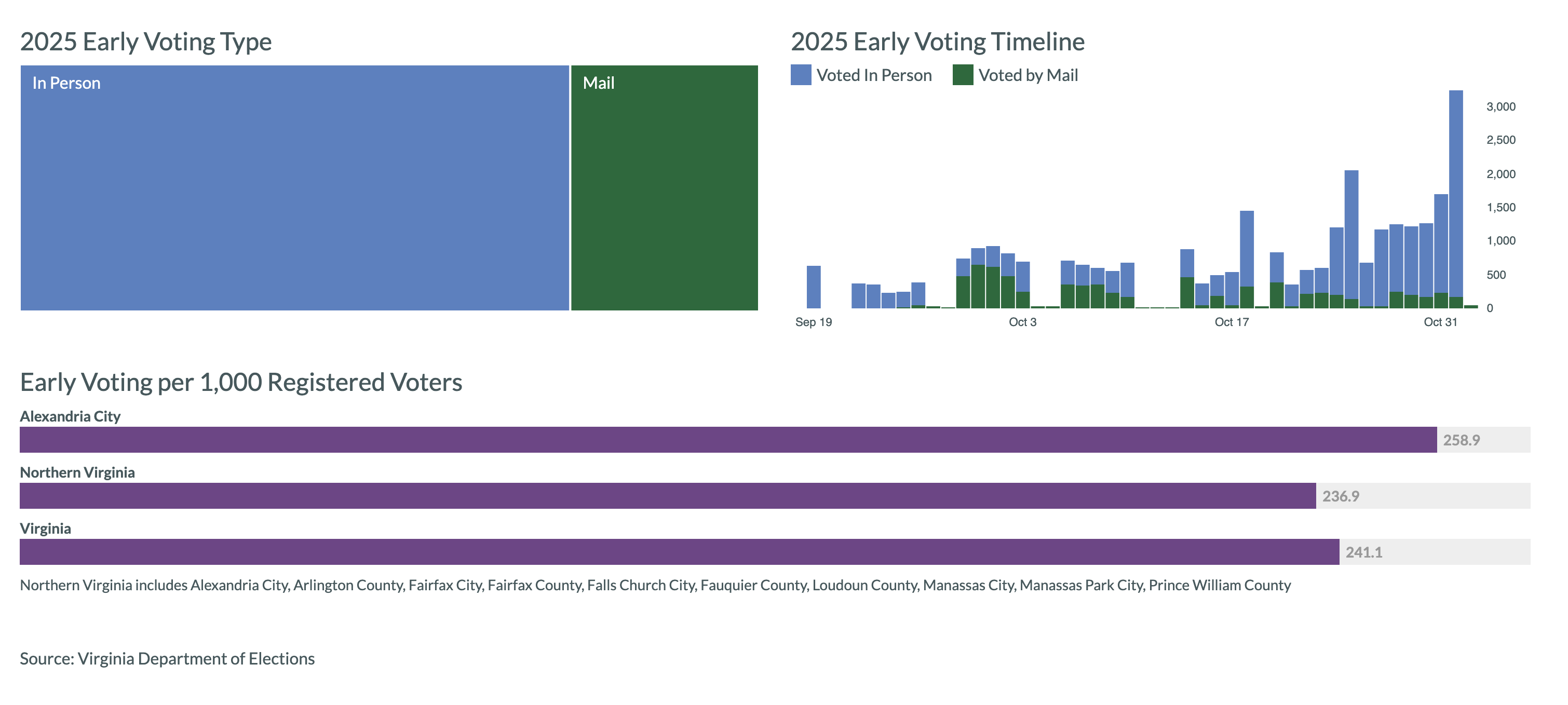 Alexandria recorded 258.9 early votes per 1,000 registered voters, compared to 236.9 in Northern Virginia and 241.1 statewide, according to data from the Virginia Department of Elections.
