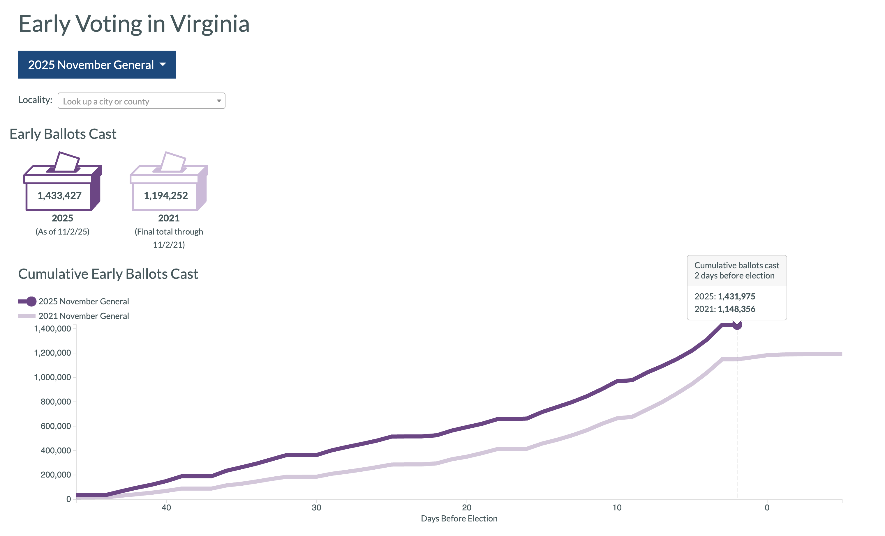 The surge in early voting reflects a statewide trend, with Virginia recording 1,431,975 early votes as of Nov. 2 — nearly 25% more than the 1,148,356 cast at the same point in 2021. Statewide, 1,132,092 votes were cast in person and 301,335 by mail through the end of early voting.