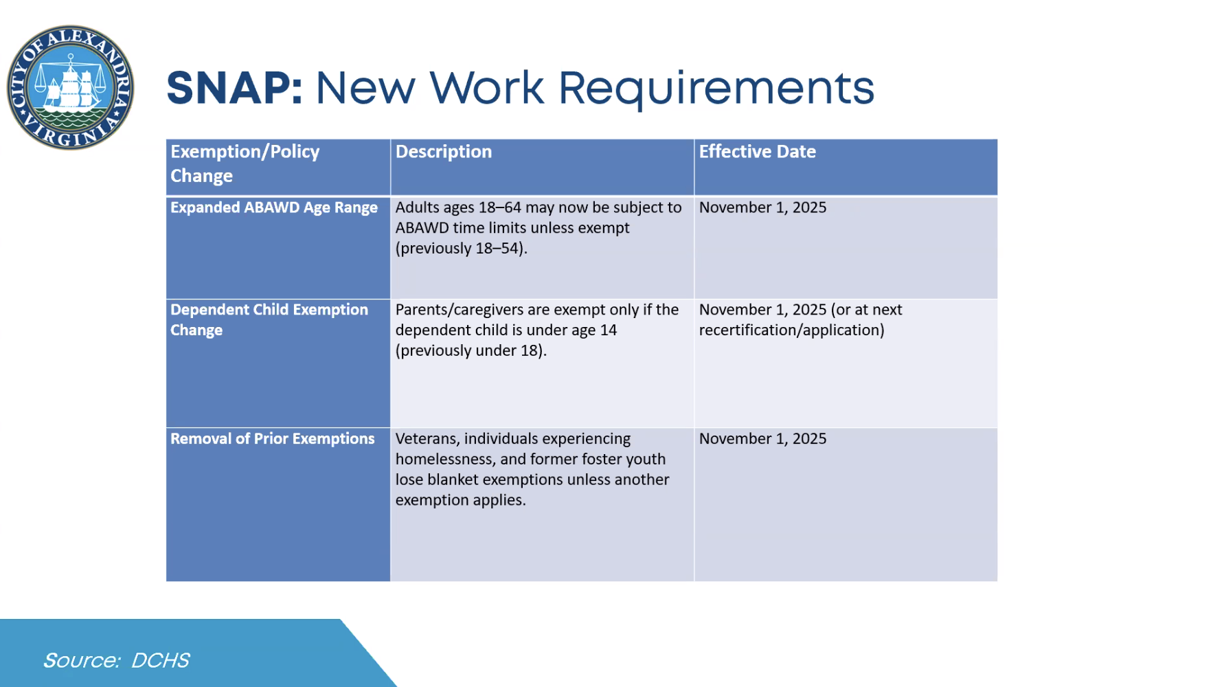 New federal SNAP requirements are adding pressure on low-income residents. Work requirements that took effect Nov. 1 expanded the age range for time-limited benefits from 18-54 to 18-64 and tightened exemptions for parents with dependent children. Veterans, individuals experiencing homelessness and former foster youth also lost blanket exemptions.