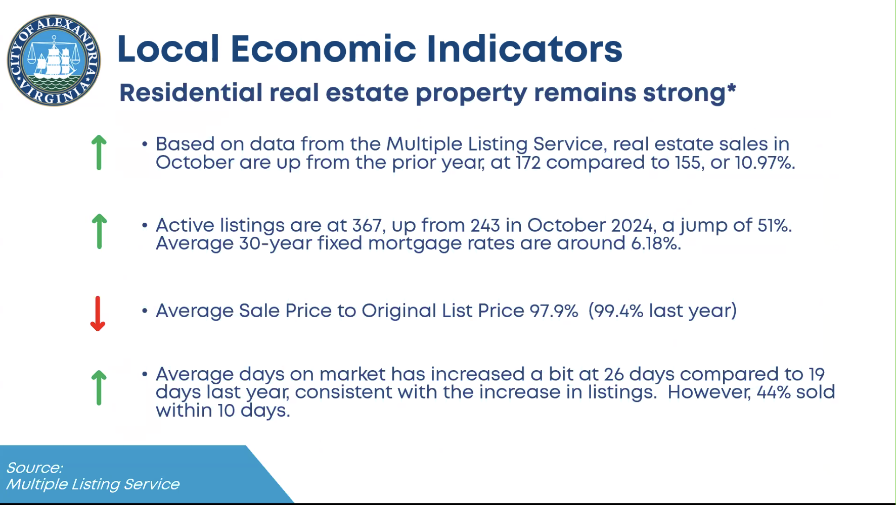 The residential real estate market offered some positive news. Sales in October reached 172, up nearly 11 percent from 155 a year ago. Active listings jumped 51 percent to 367 homes, giving buyers more options. Average 30-year fixed mortgage rates are around 6.18 percent.