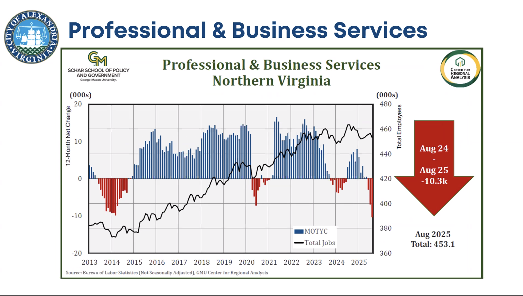 The Northern Virginia region has lost more than 6,000 federal jobs over the past year, with total federal employment falling to 87,900 in August — a 6,600-job decline from the same month in 2024. The professional and business services sector, a major driver of the region’s higher incomes, shed approximately 10,300 positions over the same period.