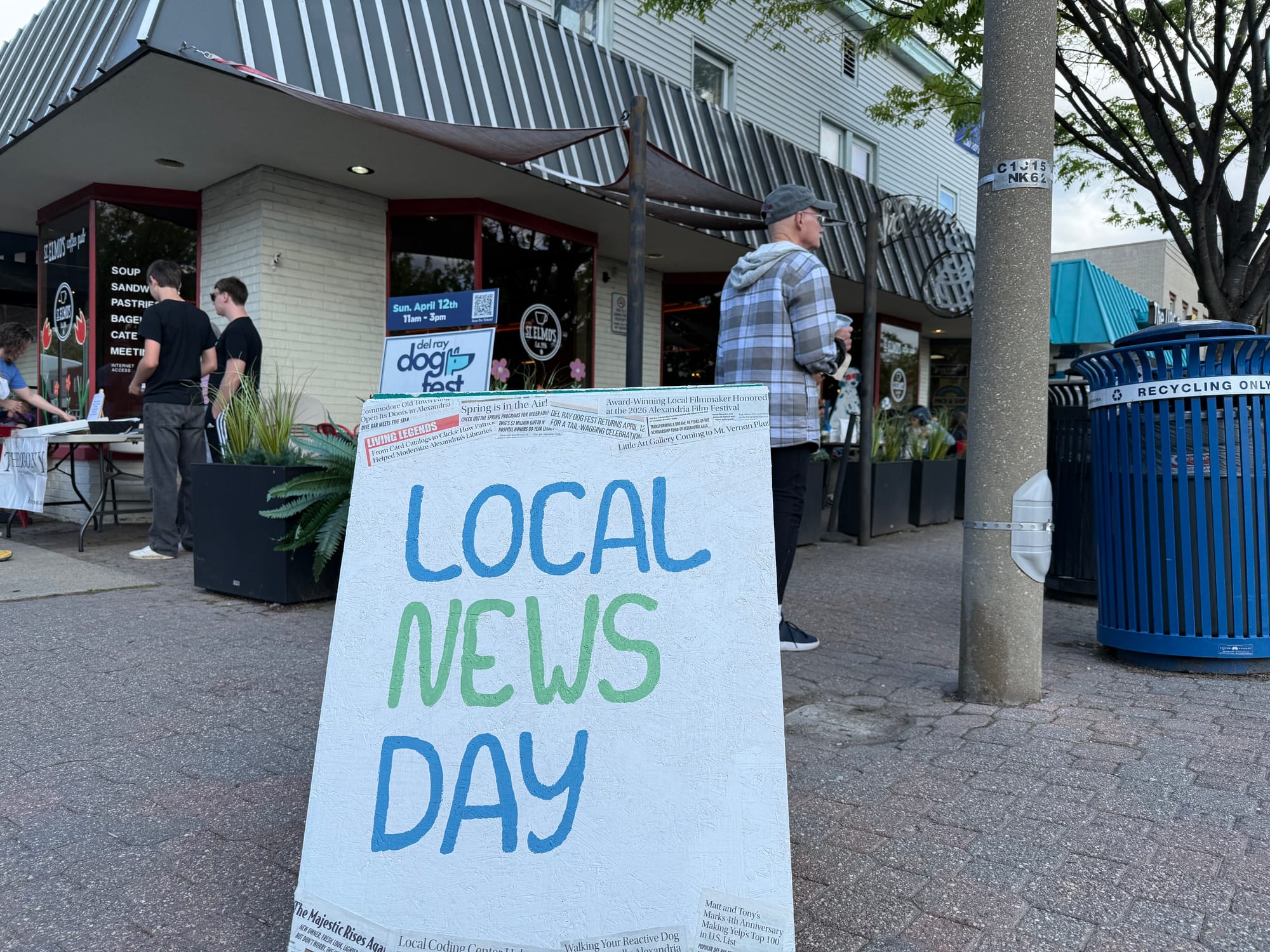 Over the weekend of April 11 and 12, Bloom Labs founder Stephen Jefferson and students from Theogony, the student newspaper of Alexandria City High School, staffed three Local News Day pop-up events across Alexandria — Saturday morning at St. Elmo's Coffee Pub in Del Ray, and Sunday at both the Old Town North Farmers Market and the Four Mile Run Farmers Market. The Alexandria Brief stopped by all three.