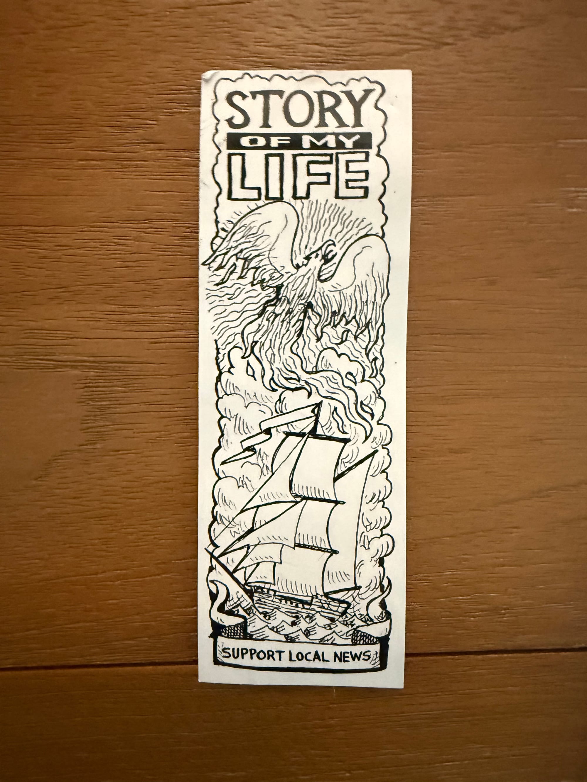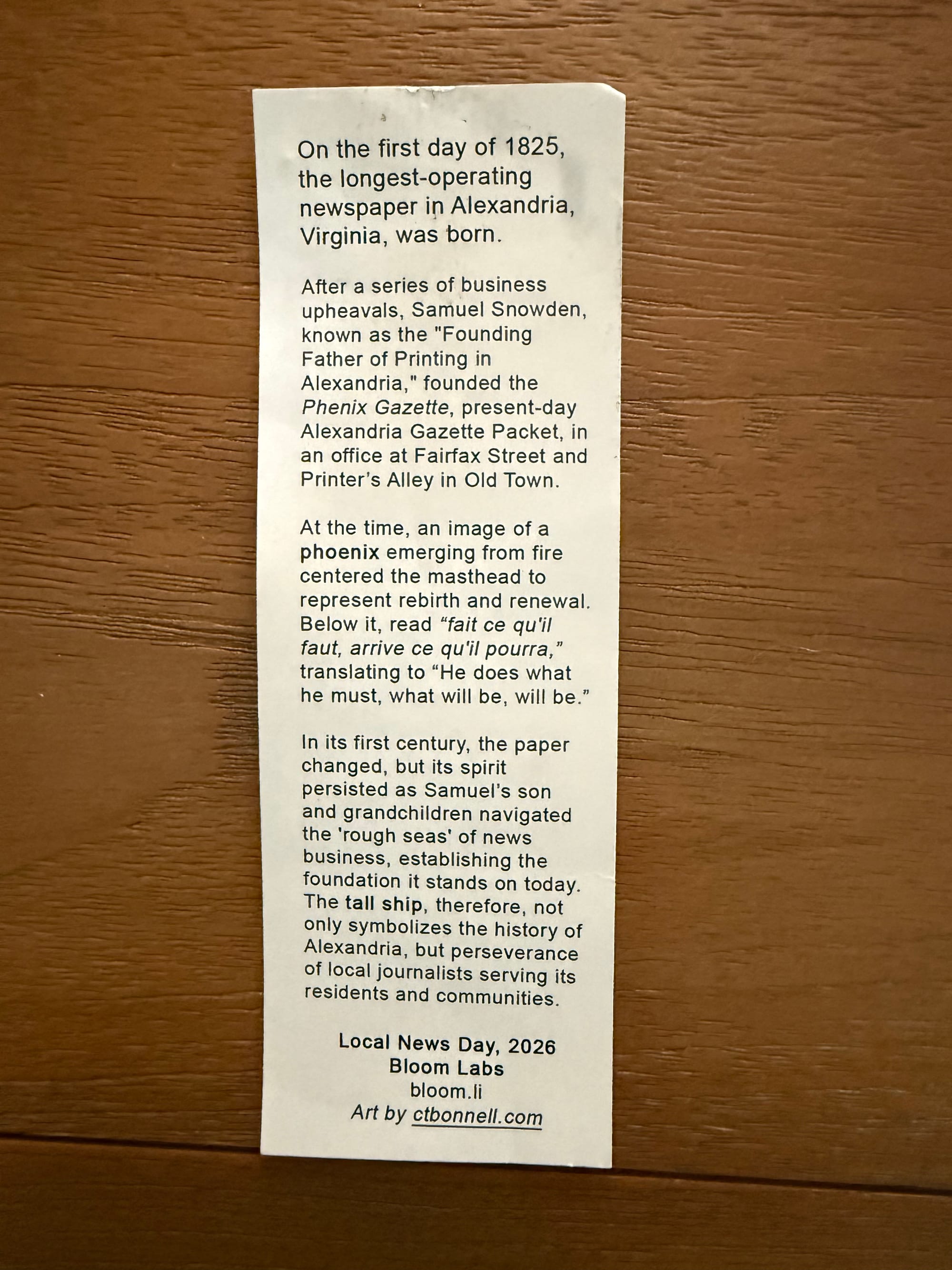 At each pop-up, passersby could pick up profile cards for The Alexandria Brief, ALXnow and Theogony — all three official Local News Day newsroom partners — each with a QR code linking directly to the outlet's website, newsletter or support page. The table also featured historic Alexandria newspaper front pages and bookmarks designed by local artist Chris Bonnell — a striking hand-drawn illustration of a tall ship and phoenix, printed alongside the story of Samuel Snowden, who founded the Phenix Gazette, the predecessor to today's Alexandria Gazette Packet, on the first day of 1825. The bookmark's motto, drawn from the original paper's masthead, reads: "He does what he must, what will be, will be."