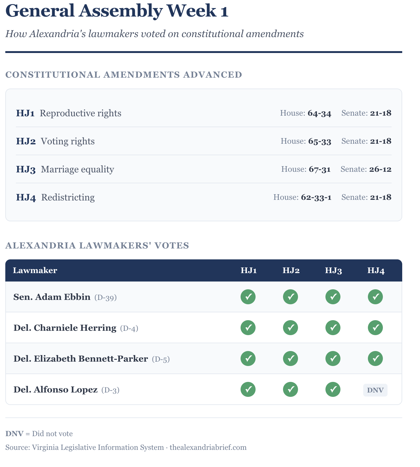 The Alexandria Brief is tracking legislation from the four state lawmakers who represent portions of Alexandria: Sen. Adam Ebbin (SD-39), Del. Charniele Herring (HD-4), Del. Elizabeth Bennett-Parker (HD-5), and Del. Alfonso Lopez (HD-3).