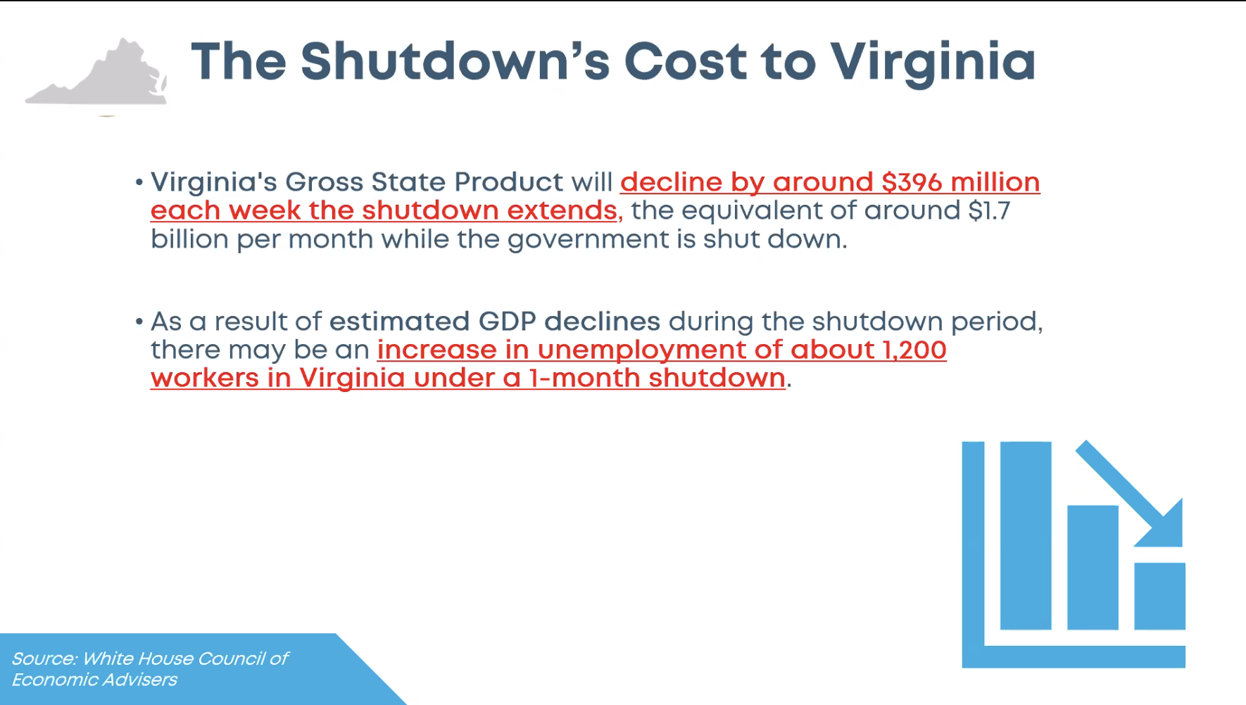 Virginia’s gross state product will decline by around $396 million each week the shutdown extends, the equivalent of around $1.7 billion per month, according to White House Council of Economic Advisers estimates. A one-month shutdown could increase unemployment by about 1,200 workers in Virginia.