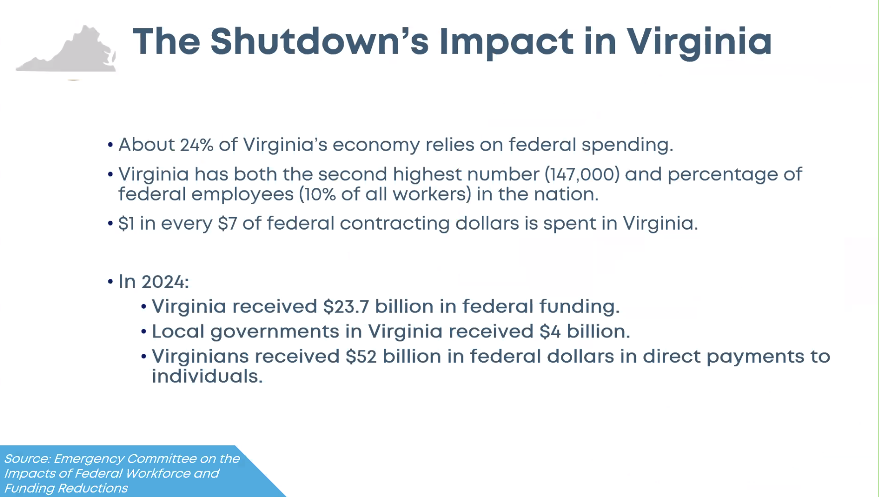 Virginia’s economy proves especially susceptible to federal disruptions. About 24% of the state’s economy relies on federal spending, and Virginia has the second-highest number (147,000) and percentage (10% of all workers) of federal employees in the nation.