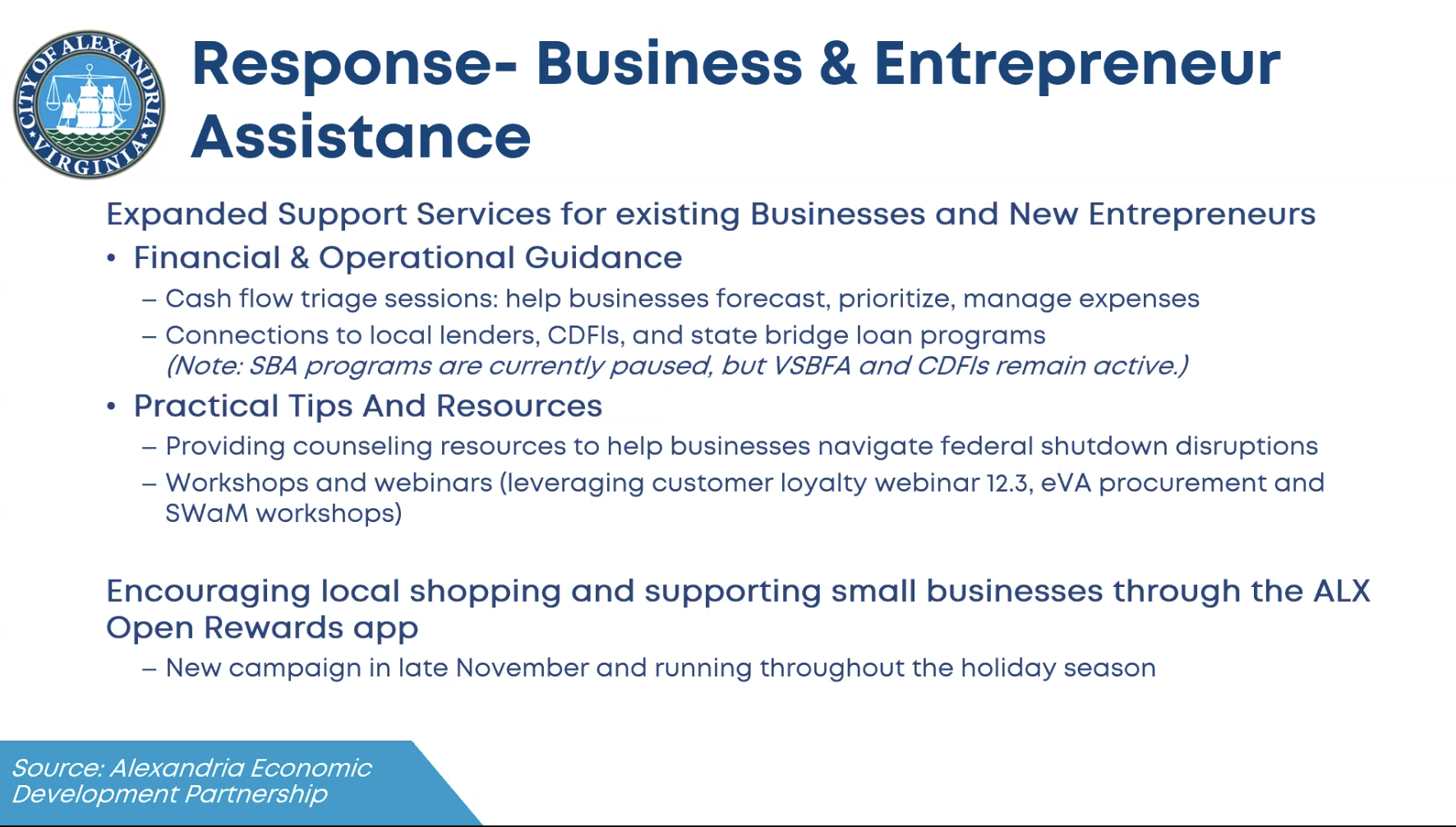 The Alexandria Economic Development Partnership is also providing counseling resources to help businesses navigate federal shutdown disruptions, along with workshops and webinars on customer loyalty, eVA procurement, and SWaM workshops.