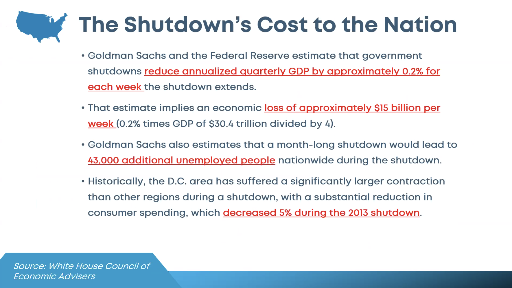 The shutdown — now the longest in U.S. history — is exacting a heavy toll on the national economy. Goldman Sachs and Federal Reserve estimates indicate the shutdown reduces GDP by 0.2% each week it continues, representing an economic loss of approximately $15 billion per week nationally.