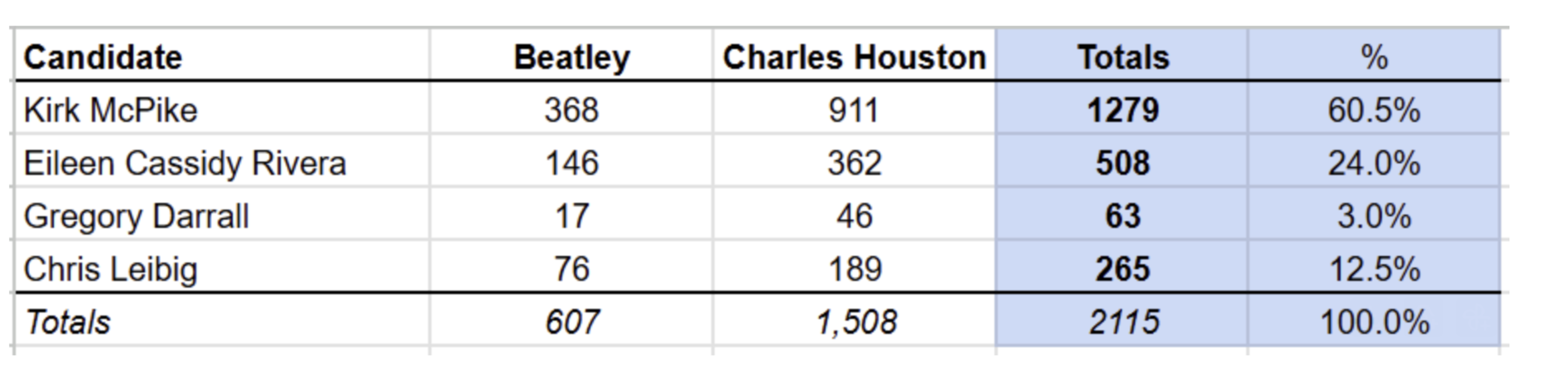 McPike received 1,279 votes (60.5%), according to results released by the Alexandria Democratic Committee. Former School Board member Eileen Cassidy Rivera finished second with 508 votes (24.0%), followed by criminal defense attorney Chris Leibig with 265 votes (12.5%) and Gregory Darrall with 63 votes (3.0%).