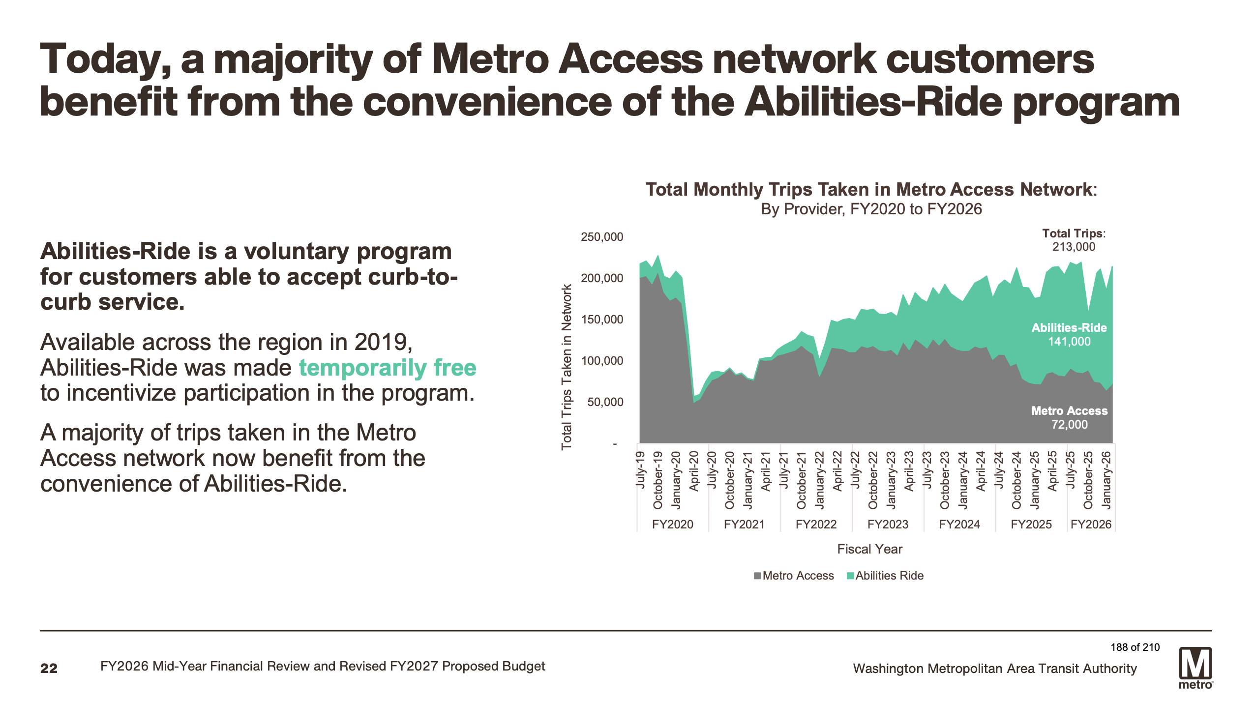 Paratransit riders should be aware of one new cost. The revised budget proposes a $3 per-trip administrative fee for Abilities-Ride trips beginning July 1, 2026. The program, which provides curb-to-curb service and has been free since its regional rollout in 2019, now accounts for the majority of trips taken in the Metro Access network, according to the budget presentation.