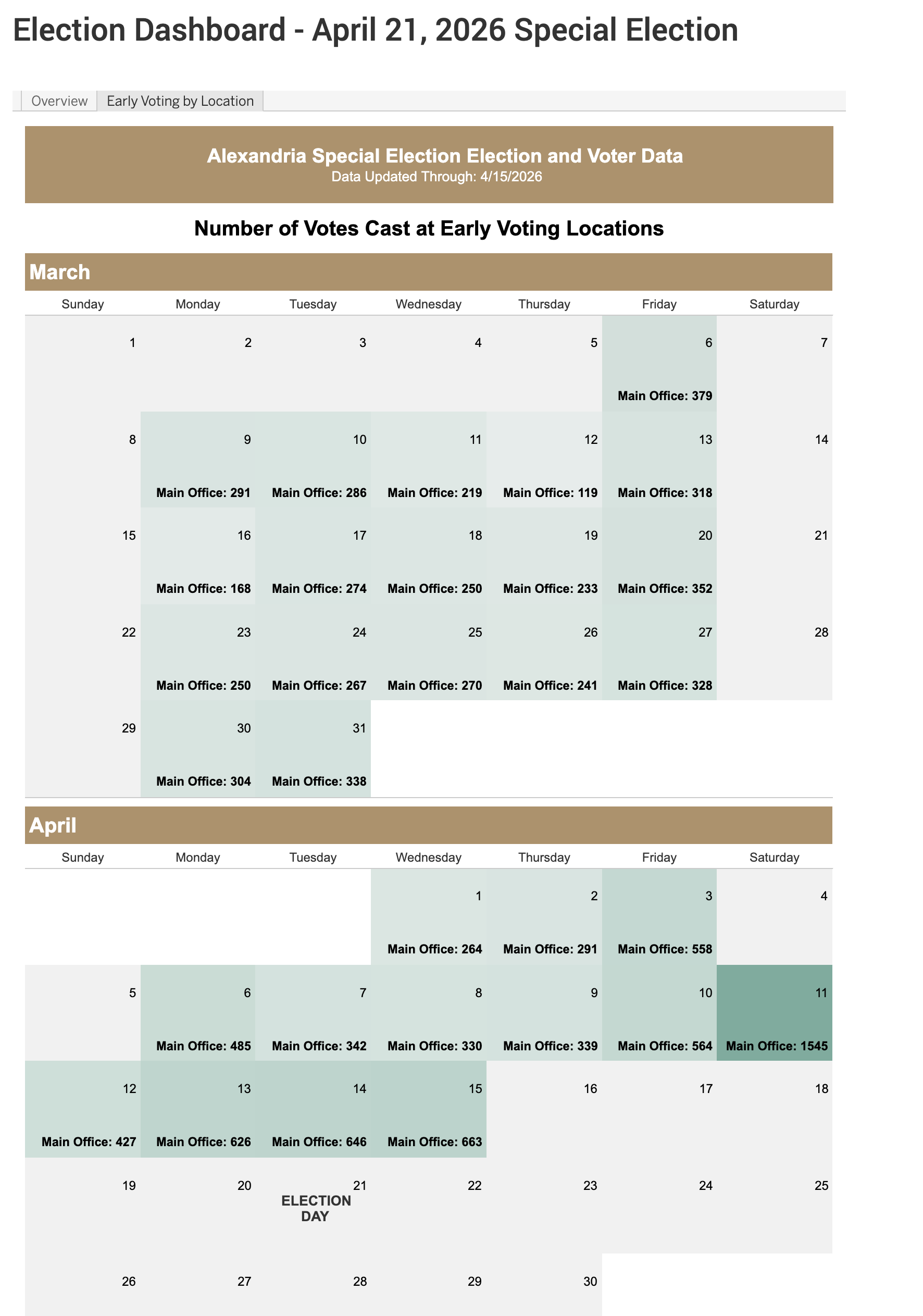 According to the city's election dashboard, updated through Wednesday, a combined 18,227 Alexandria voters have already cast ballots — 11,967 in person and 6,260 by mail. That represents roughly 17.8% of the city's 102,597 active registered voters, up from about 13% just six days ago.