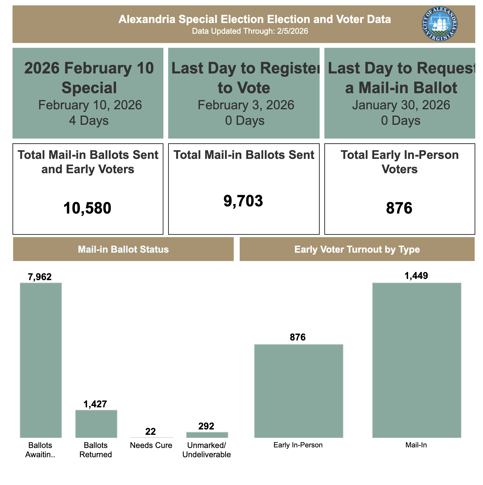 As of Feb. 5, 876 voters had cast ballots in person during early voting, and 1,449 had returned mail-in ballots. Another 7,962 mail-in ballots are still outstanding. Twenty-two ballots need to be cured.