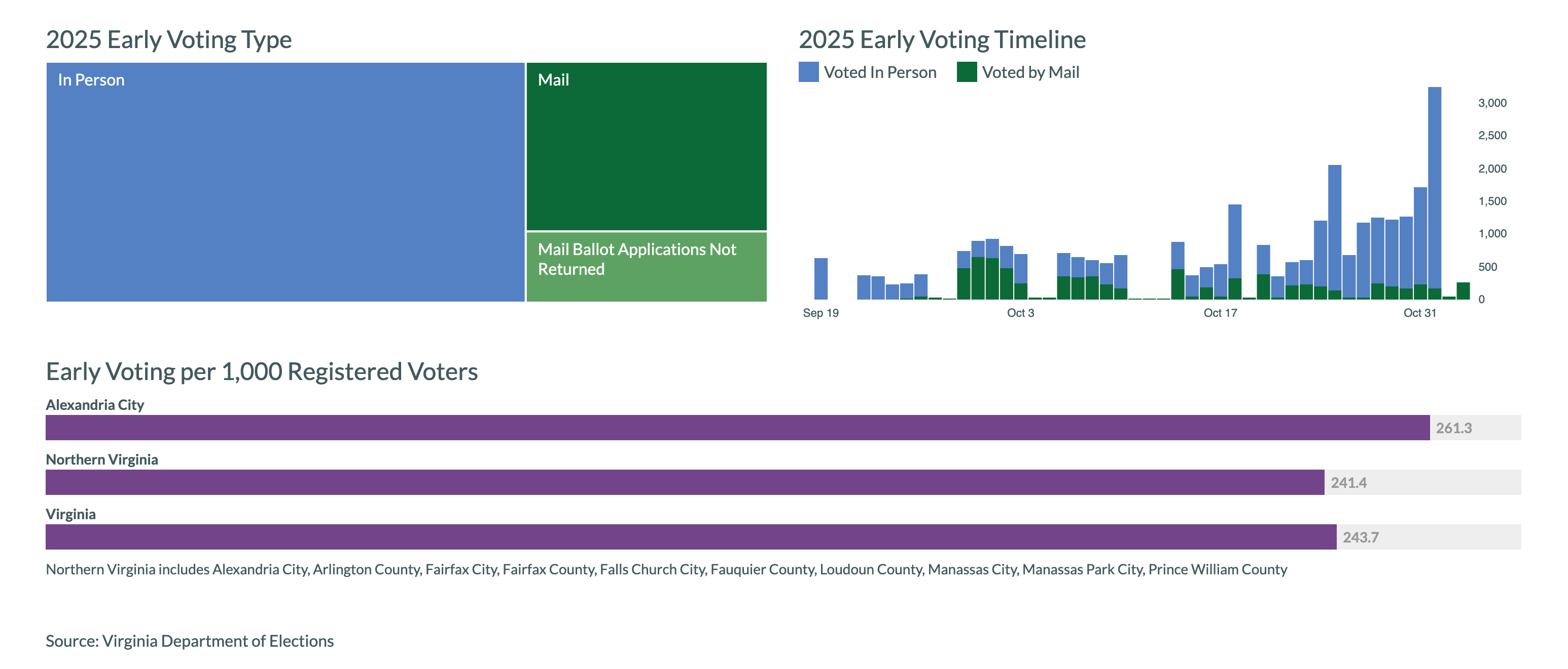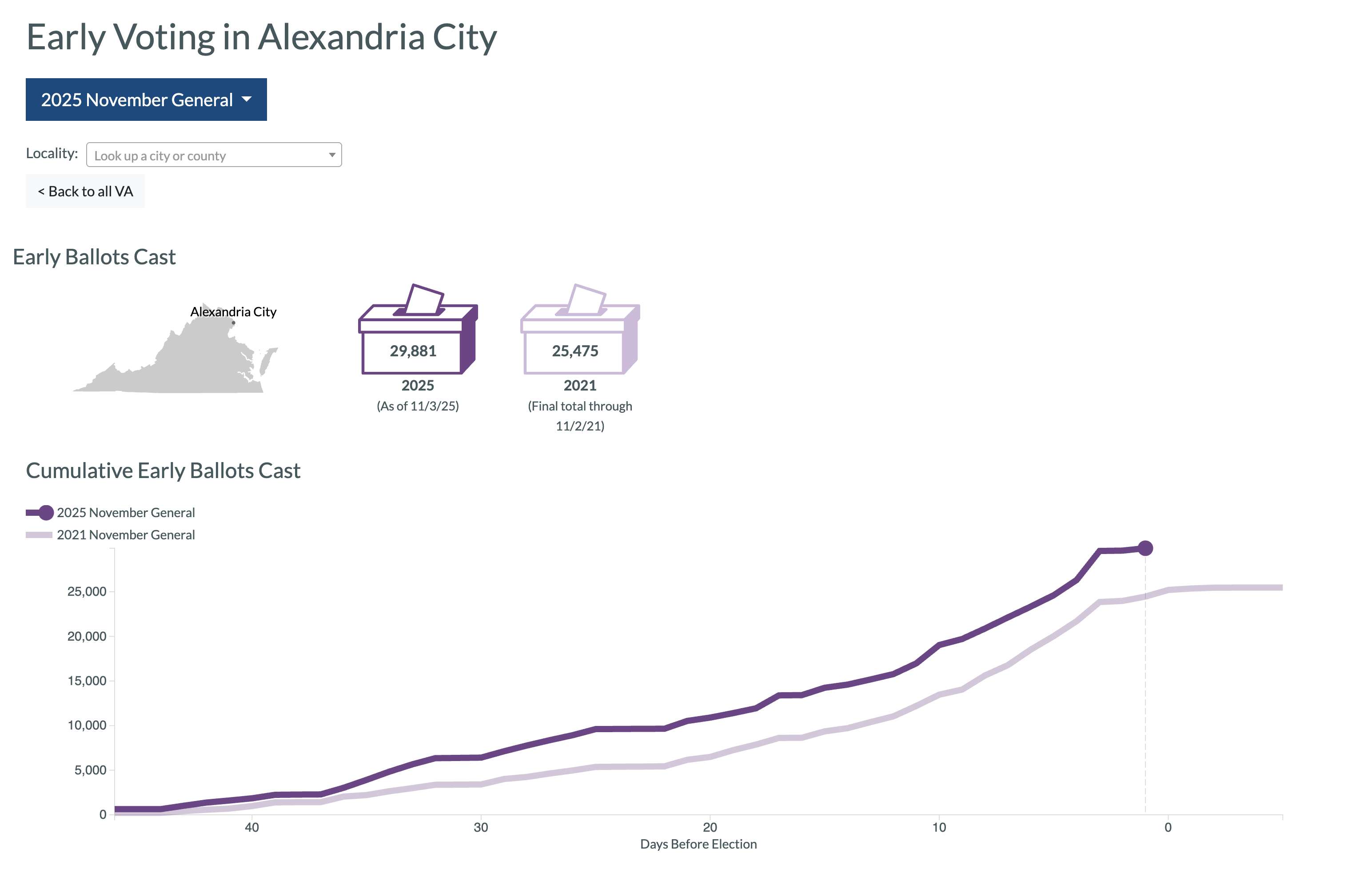 Alexandria recorded 261.3 early votes per 1,000 registered voters, compared to 241.4 in Northern Virginia and 243.7 statewide, according to Virginia Public Access Project data.