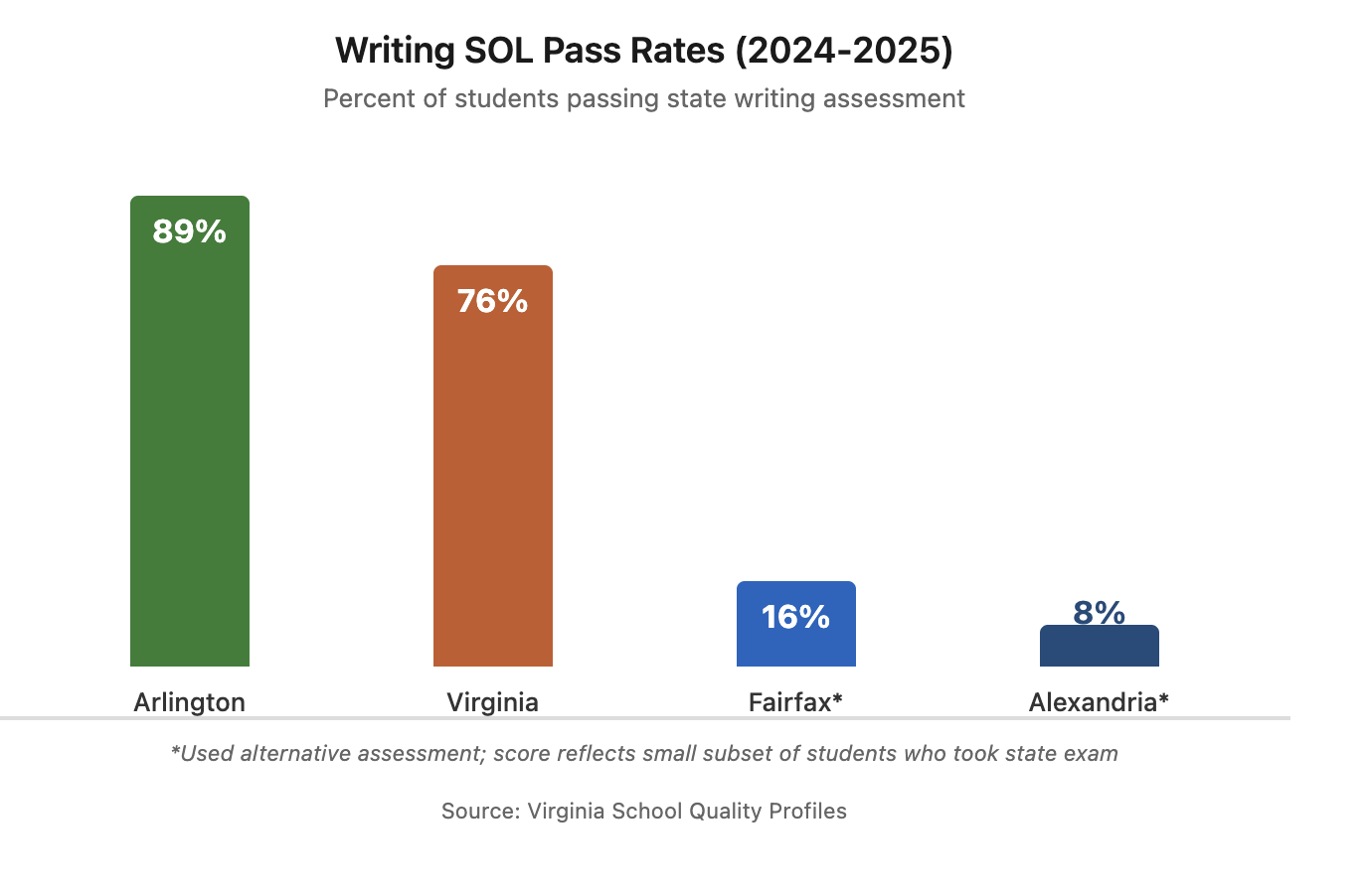 Neighboring Arlington County, which administered the state writing exam, reported an 89 percent pass rate. Fairfax County, which also uses an alternative assessment, reported 16 percent.