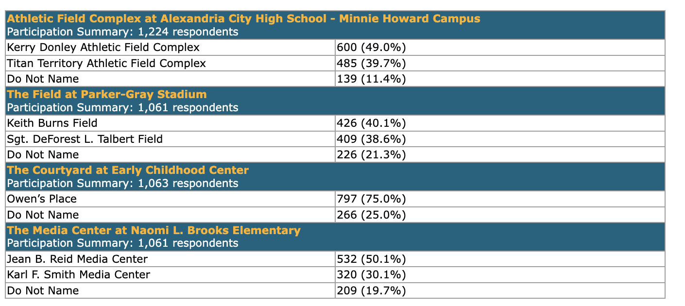 Across all four polls, the option to leave spaces unnamed drew significant support — as high as 25% for the Early Childhood Center courtyard and 21.3% for the Parker-Gray field.