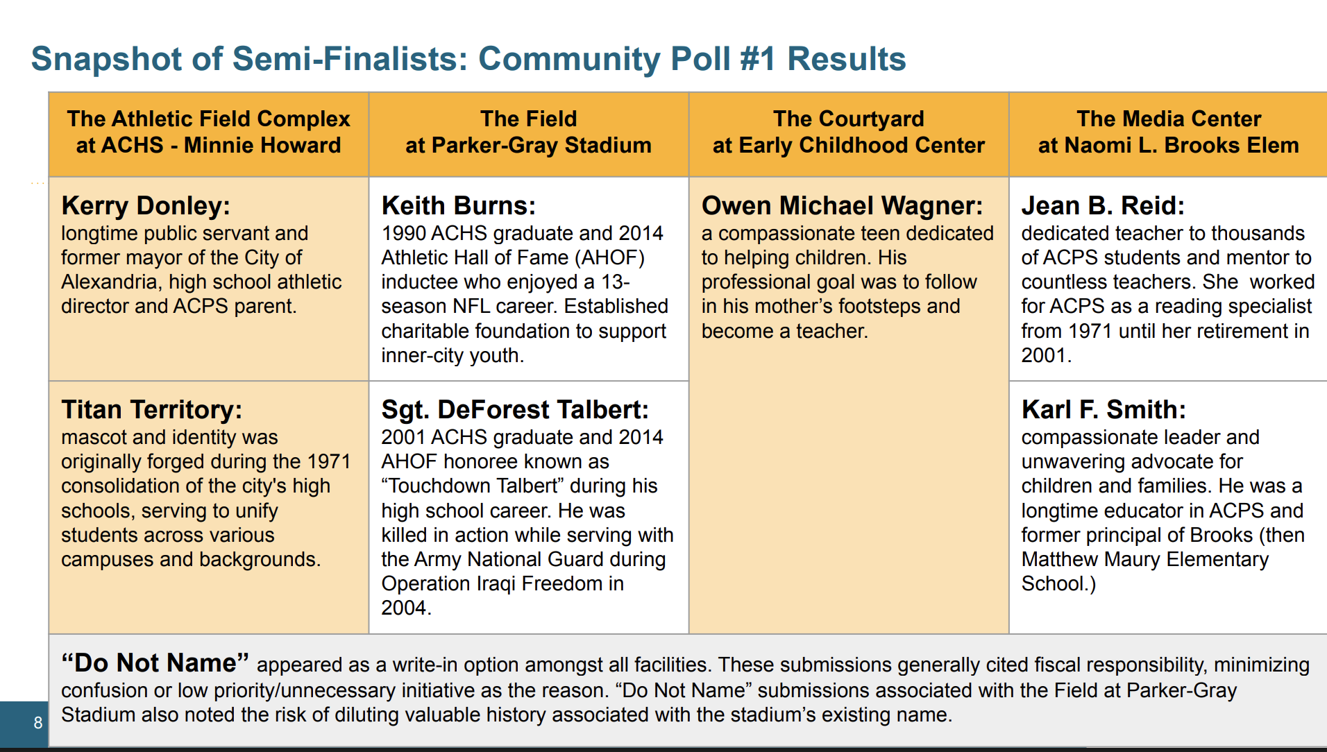 Staff noted that “Do Not Name” submissions generally cited fiscal responsibility, minimizing confusion or viewing the initiative as low priority. For Parker-Gray Stadium specifically, some respondents raised concerns about diluting the valuable history associated with the stadium’s existing name — a reference to the historic segregated school that served Alexandria’s Black students from 1920 until integration in 1965.