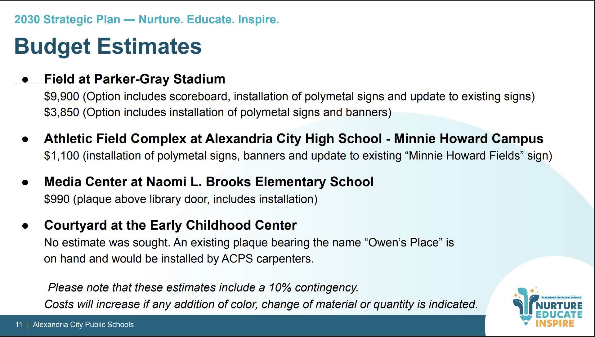 Staff say an existing plaque bearing the name is already on hand and could be installed by ACPS carpenters at no additional cost — making it the only proposal with no budget implications.