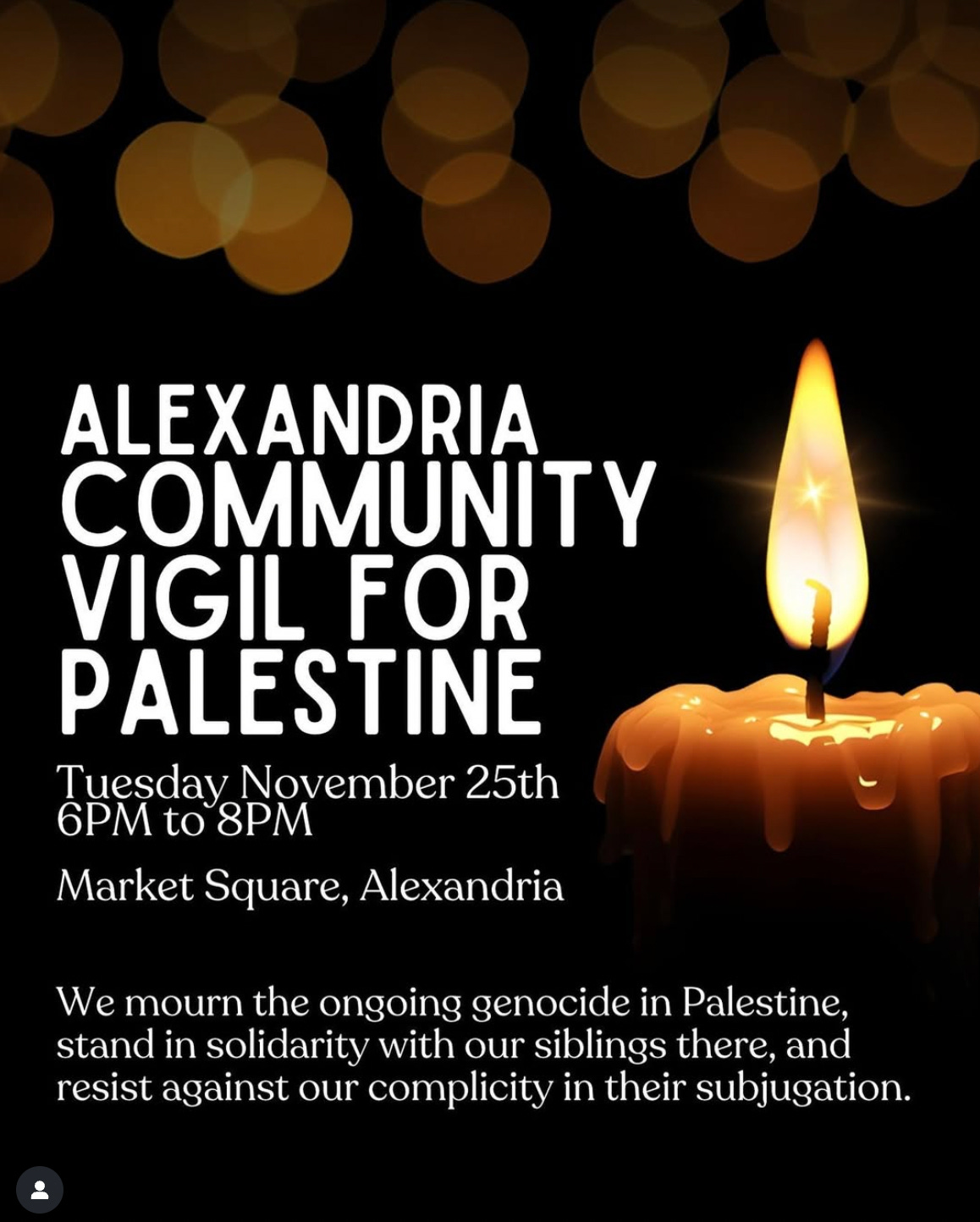 Community members held a vigil at Market Square Tuesday evening, calling on City Council to adopt an ethical investment policy that would make Alexandria the first city in Virginia to divest from companies they say are complicit in human rights abuses abroad.