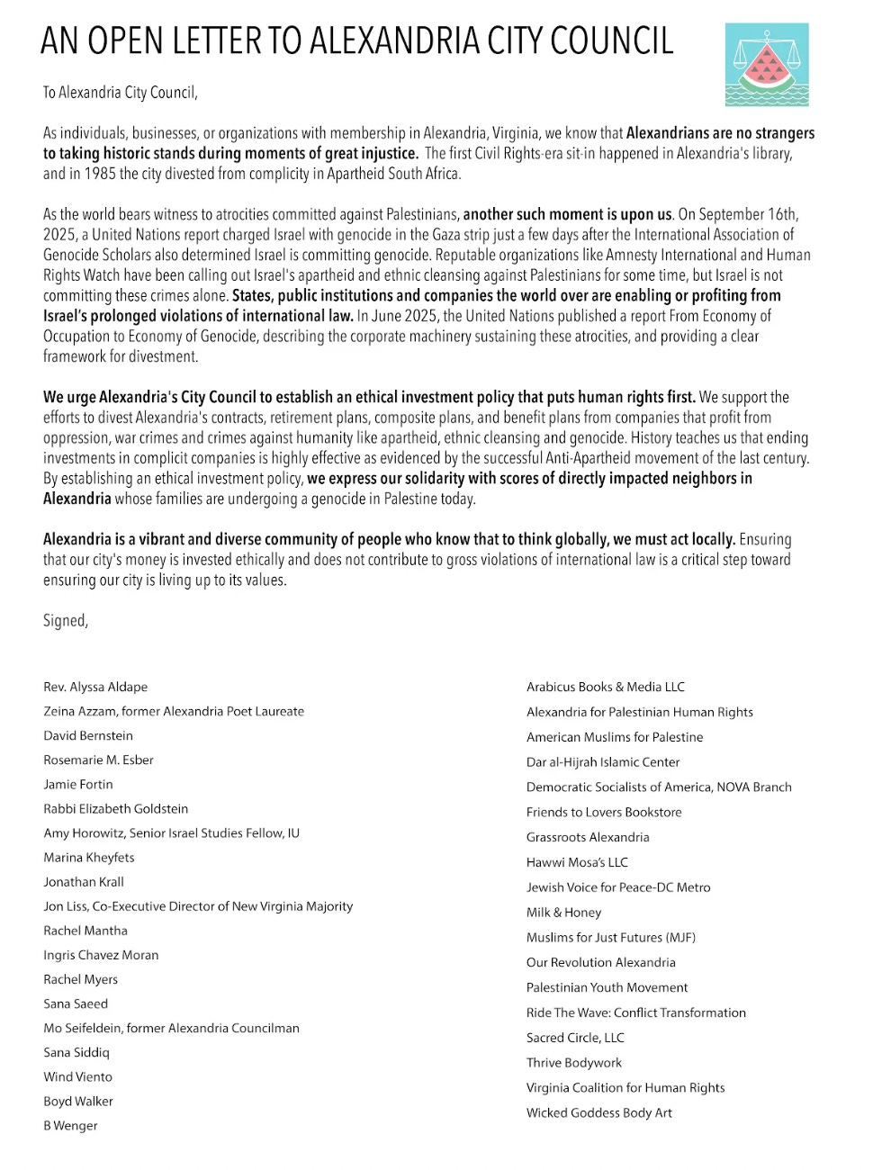 Open letter signed by nearly 40 local businesses, faith leaders and organizations calls for Alexandria to divest from companies tied to human rights violations