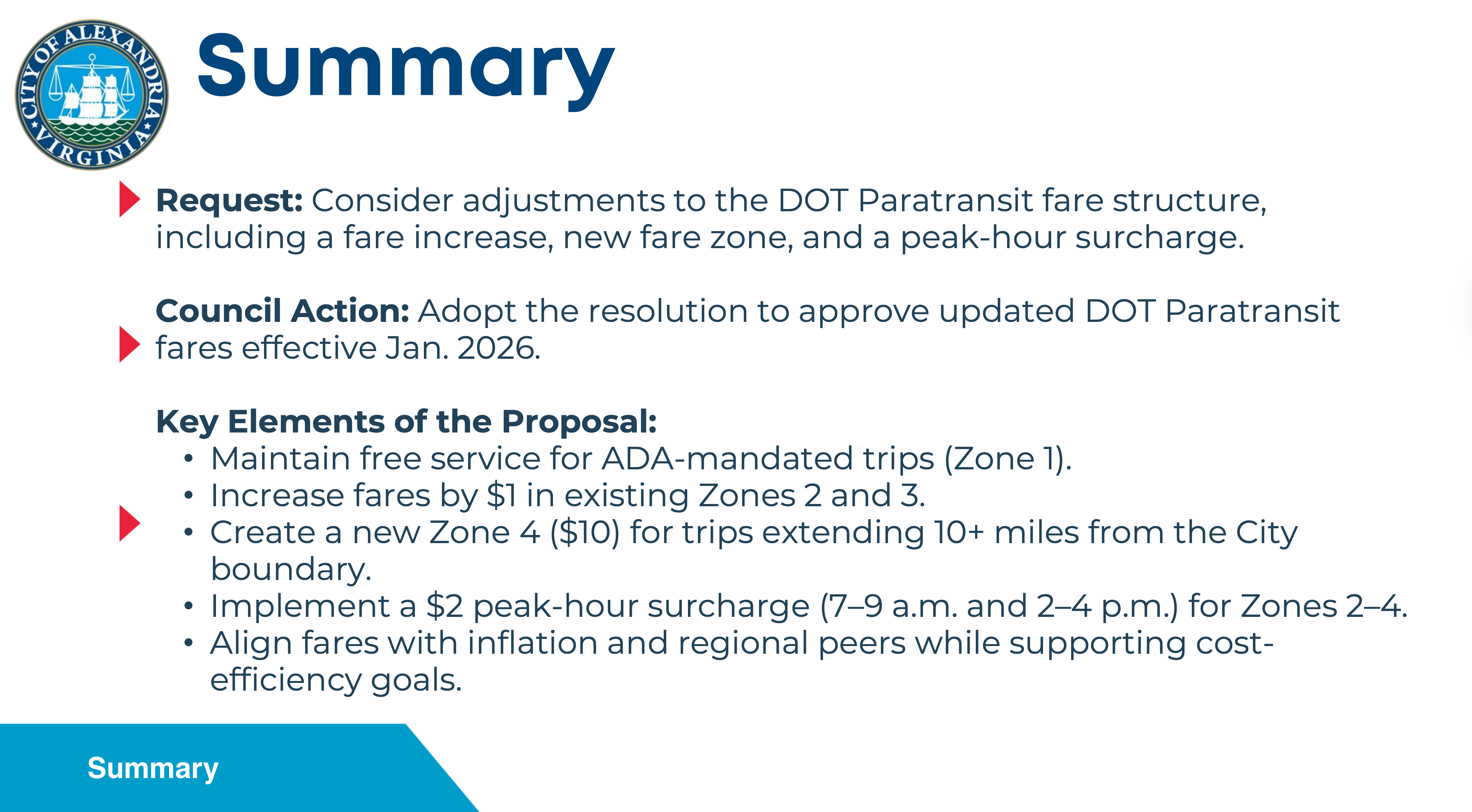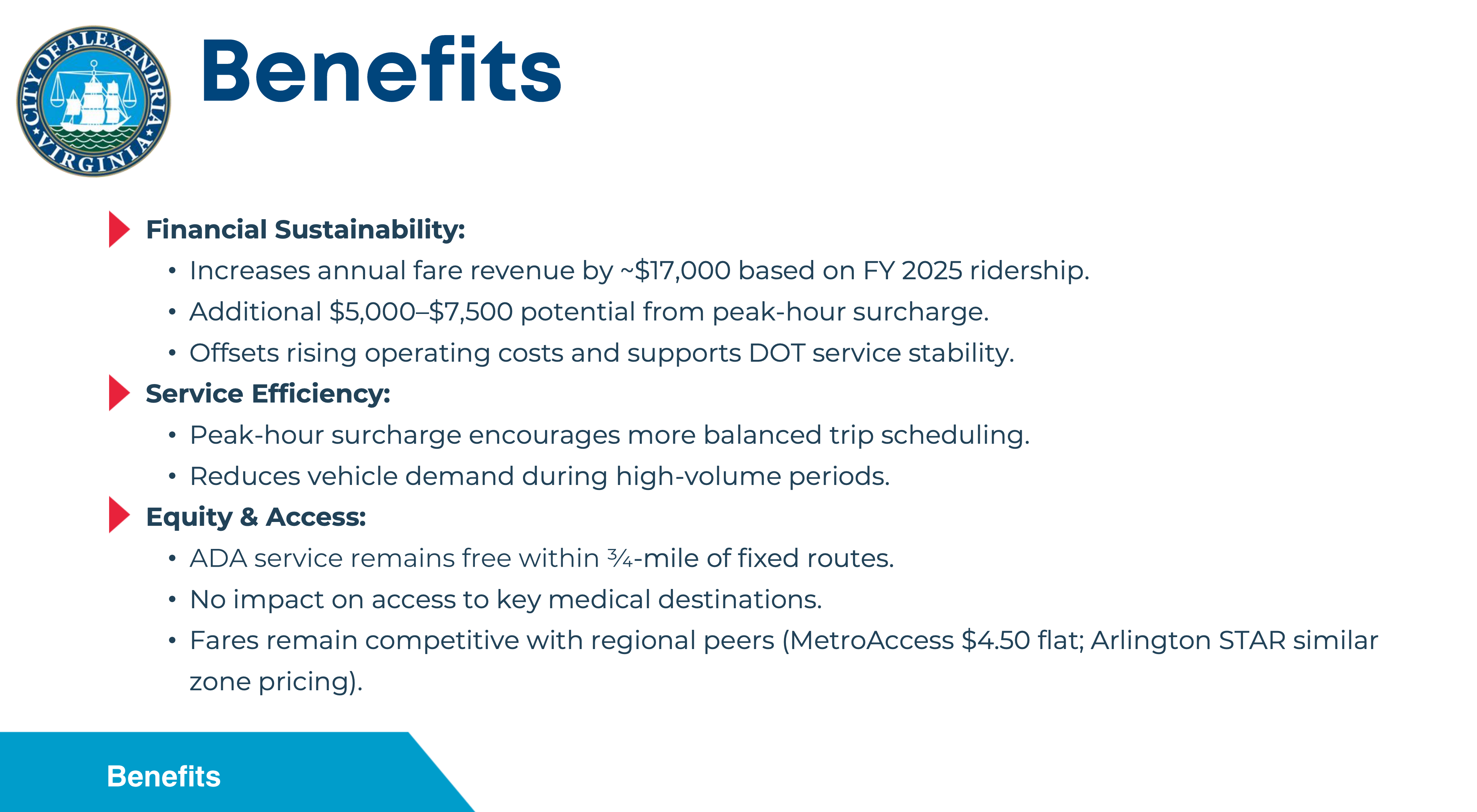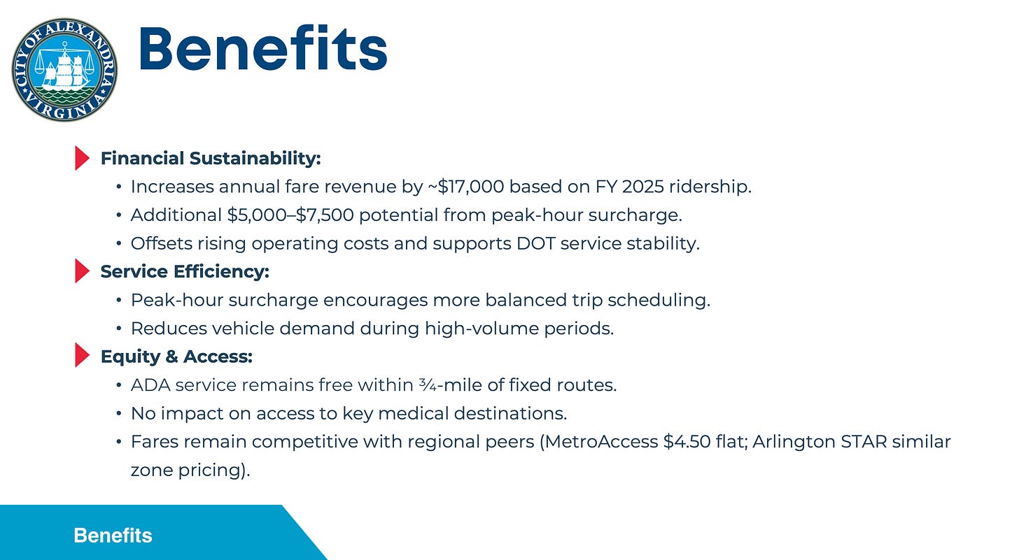 City staff said the peak-hour surcharge encourages more balanced trip scheduling and reduces vehicle demand during high-volume periods, while the fare increases help offset rising operating costs and support program stability.