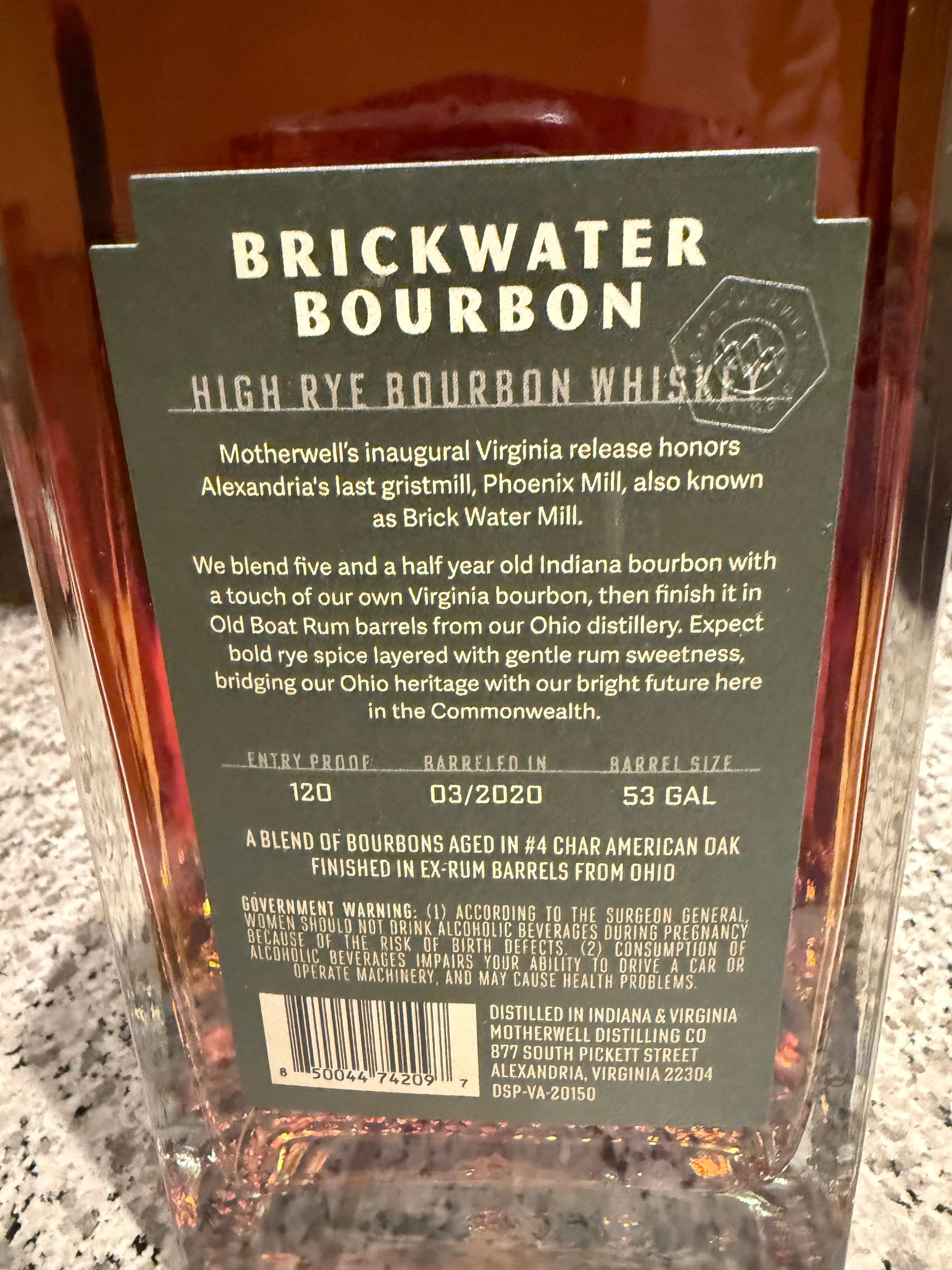 The 100-proof high-rye bourbon blends 5 1/2-year-old Indiana whiskey with Virginia-distilled bourbon, then finishes in rum barrels from Motherwell’s Ohio distillery — bridging both locations in a single bottle.
