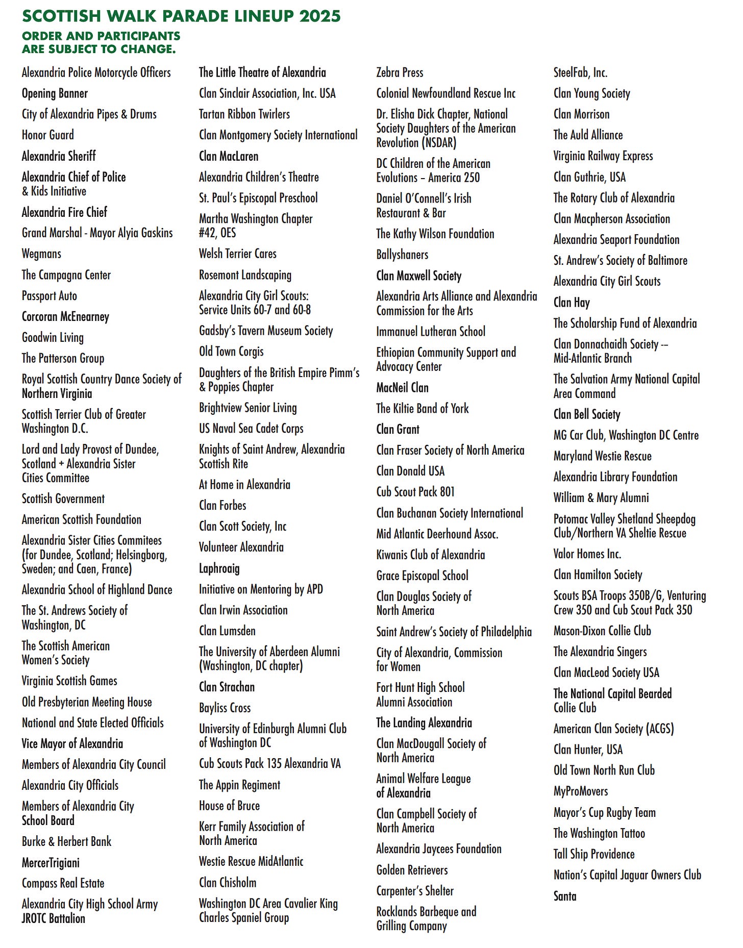 More than 150 groups will march in the Scottish Walk, including Scottish clans, community organizations, local businesses, schools and dog clubs. Here’s the full order of march: