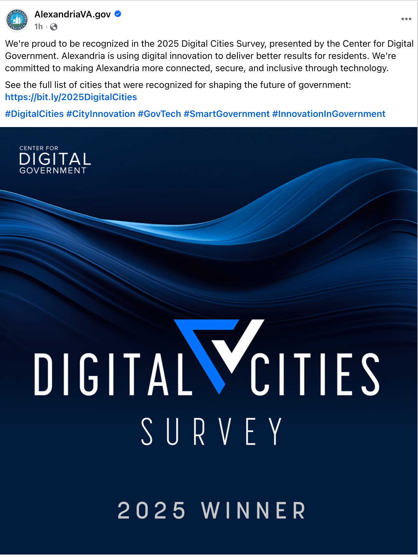 Alexandria has been recognized in the 2025 Digital Cities Survey, placing 10th nationally in its size category among cities with populations between 125,000 and 249,999, the Center for Digital Government announced this week.