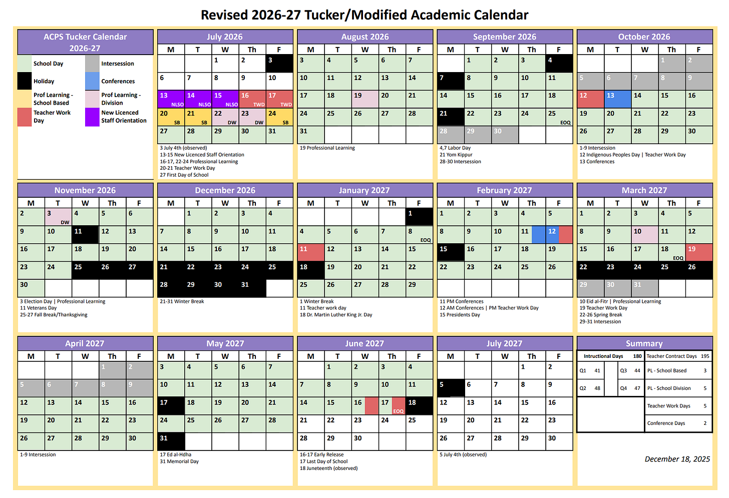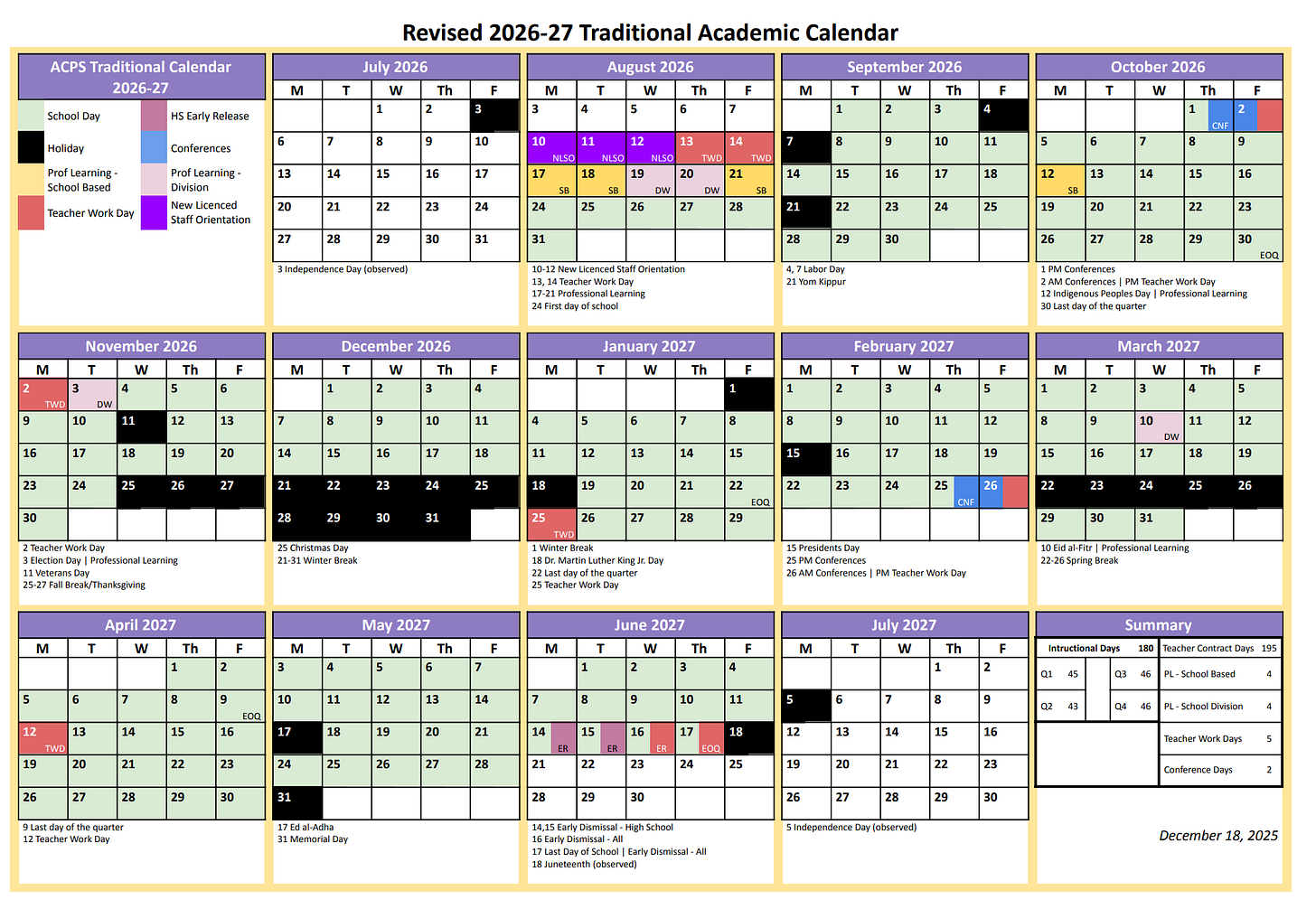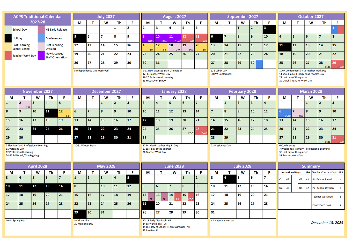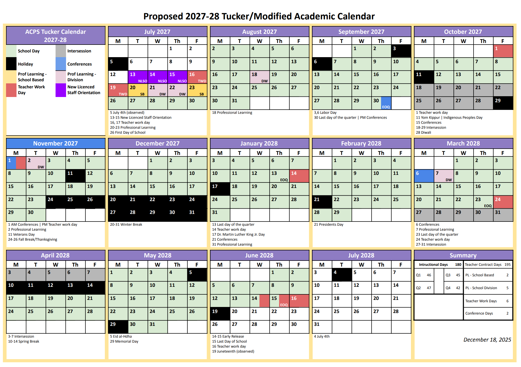 Students at most ACPS schools will start classes on Monday, August 23, 2027, and end on Tuesday, June 15, 2028. The calendar includes 180 instructional days.