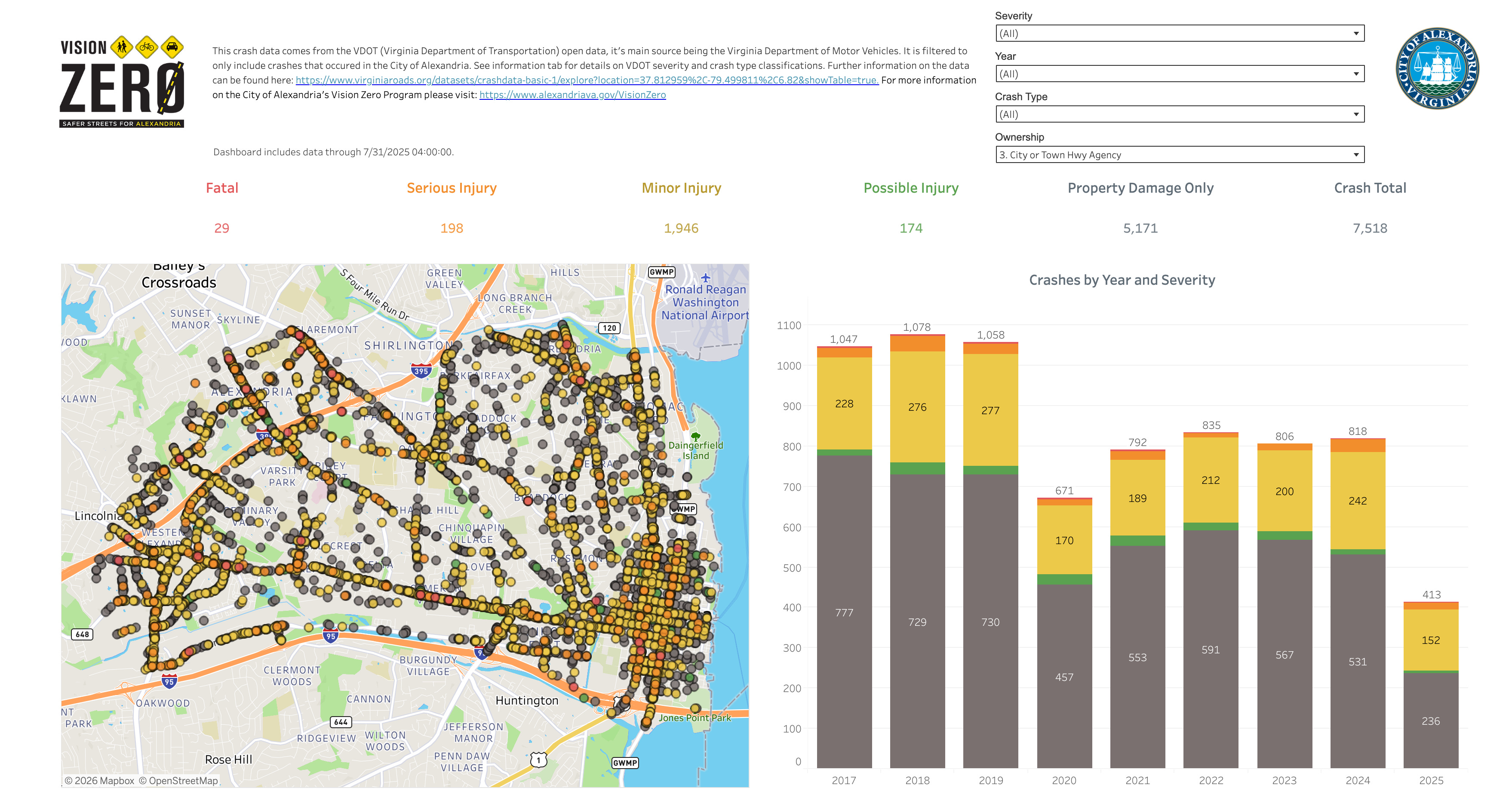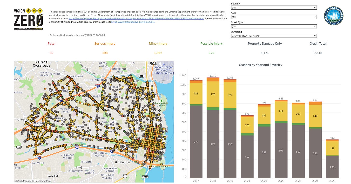 The city’s Vision Zero Crash Dashboard, which draws from Virginia Department of Transportation data, shows 29 fatal crashes and 198 serious injuries on Alexandria streets since 2017 through July 31, 2025. The city has not released an annual report covering 2024 performance.