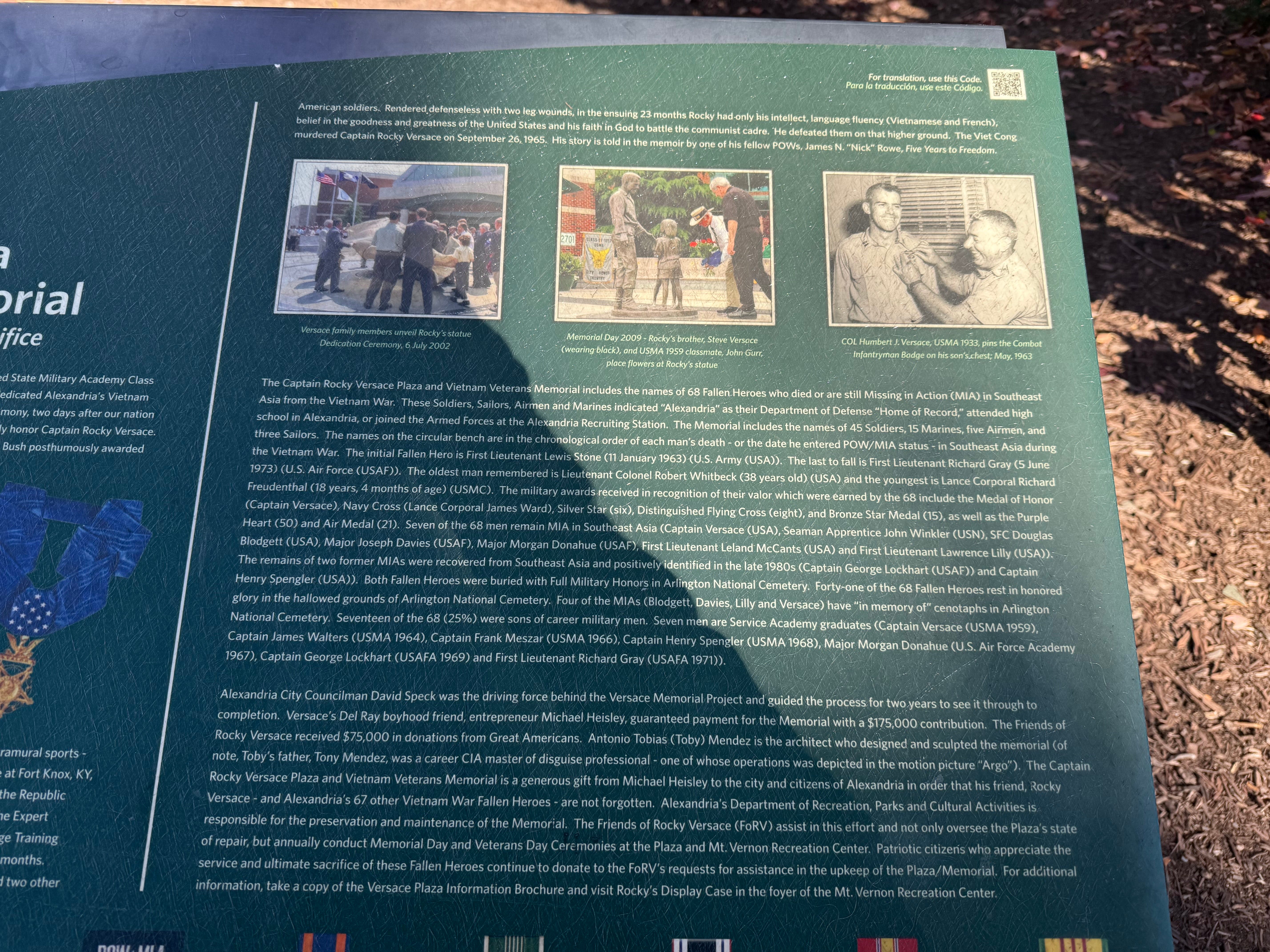 The Captain Rocky Versace Plaza and Vietnam Veterans Memorial, dedicated July 6, 2002, honors 68 Alexandria men who died or remain missing in action in Southeast Asia: 45 soldiers, 15 Marines, five airmen, and three sailors.