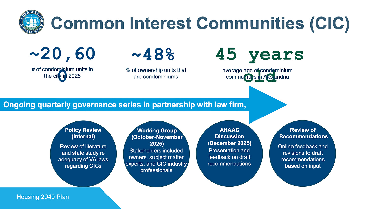 The plan also addresses the city’s aging condominium stock. About 48% of ownership units in Alexandria are condominiums, averaging 45 years old. Staff are exploring state and regional solutions to expand financing options and local tools to help associations address deferred maintenance.