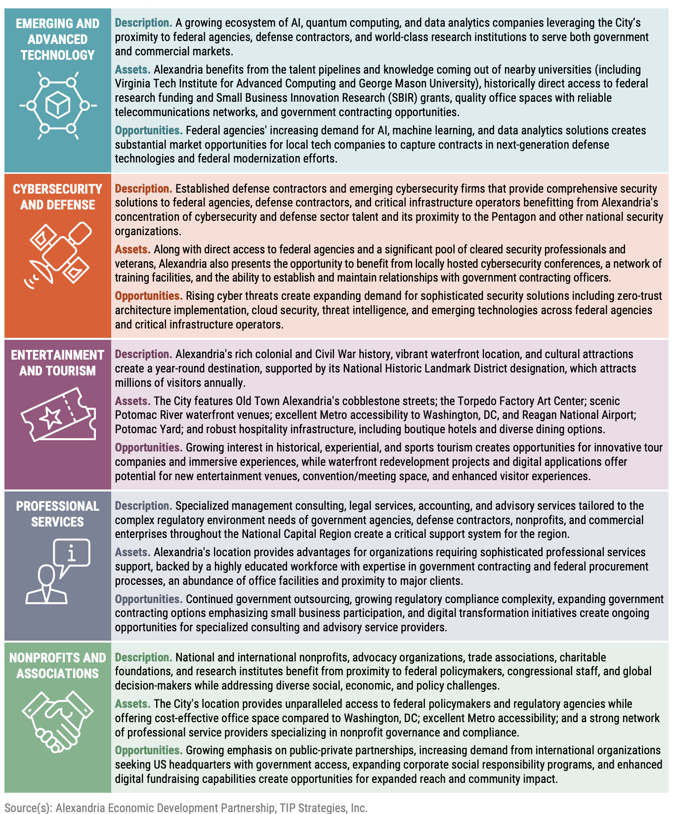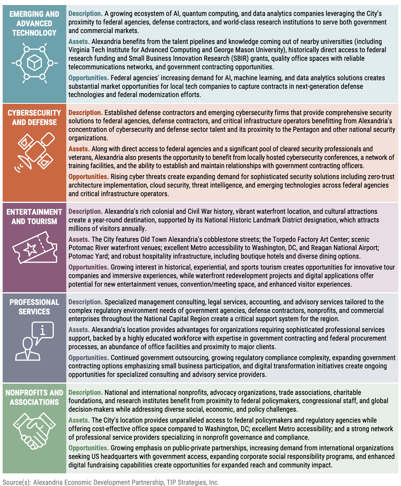 Six target industries are identified: emerging and advanced technology (AI, quantum computing, data analytics); cybersecurity and defense; entertainment and tourism; professional services; nonprofits and associations; and healthcare and innovation.