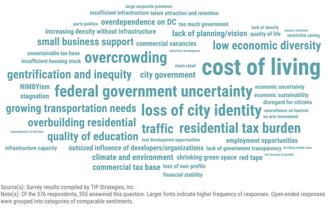 Survey respondents identified federal government uncertainty as a top concern, with “uncertain” being a top word (10.5 percent) associated with the local economy. Other concerns included cost of living, overcrowding, gentrification, loss of city identity, and traffic.