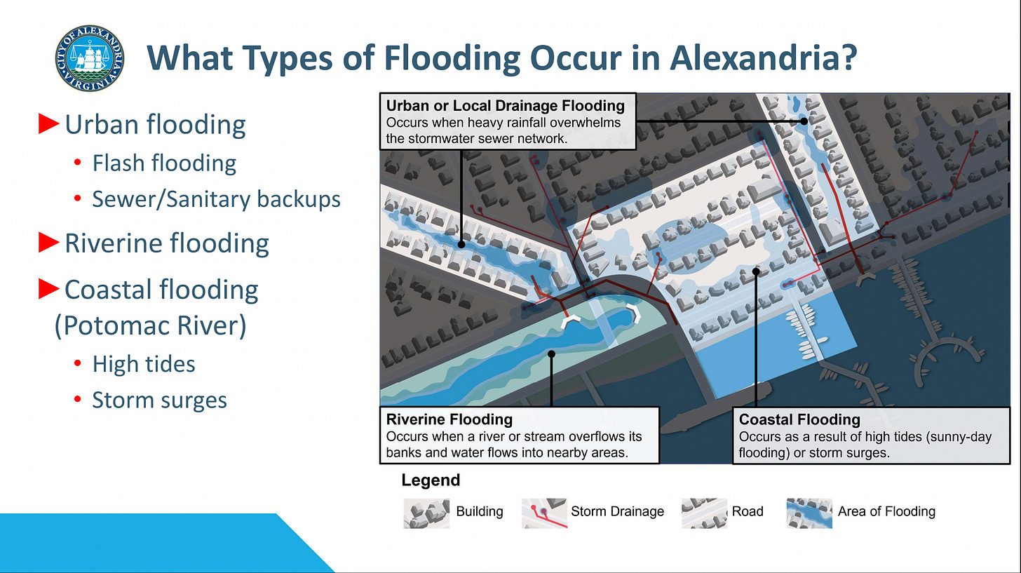 City flood modeling identifies urban flooding, including flash floods and sewer backups, riverine flooding from streams and rivers, and coastal flooding from the Potomac River caused by high tides and storm surges.