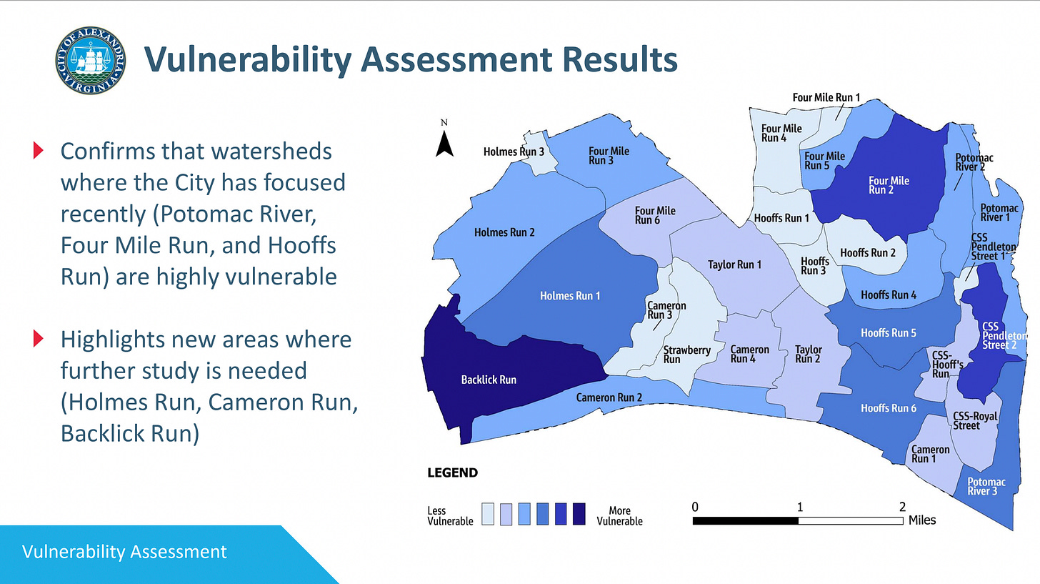 The vulnerability assessment confirms high flood risk in watersheds where the city has focused recent efforts — Potomac River, Four Mile Run, and Hooffs Run. It also highlights three areas needing further study: Holmes Run, Cameron Ru,n and Backlick Run.